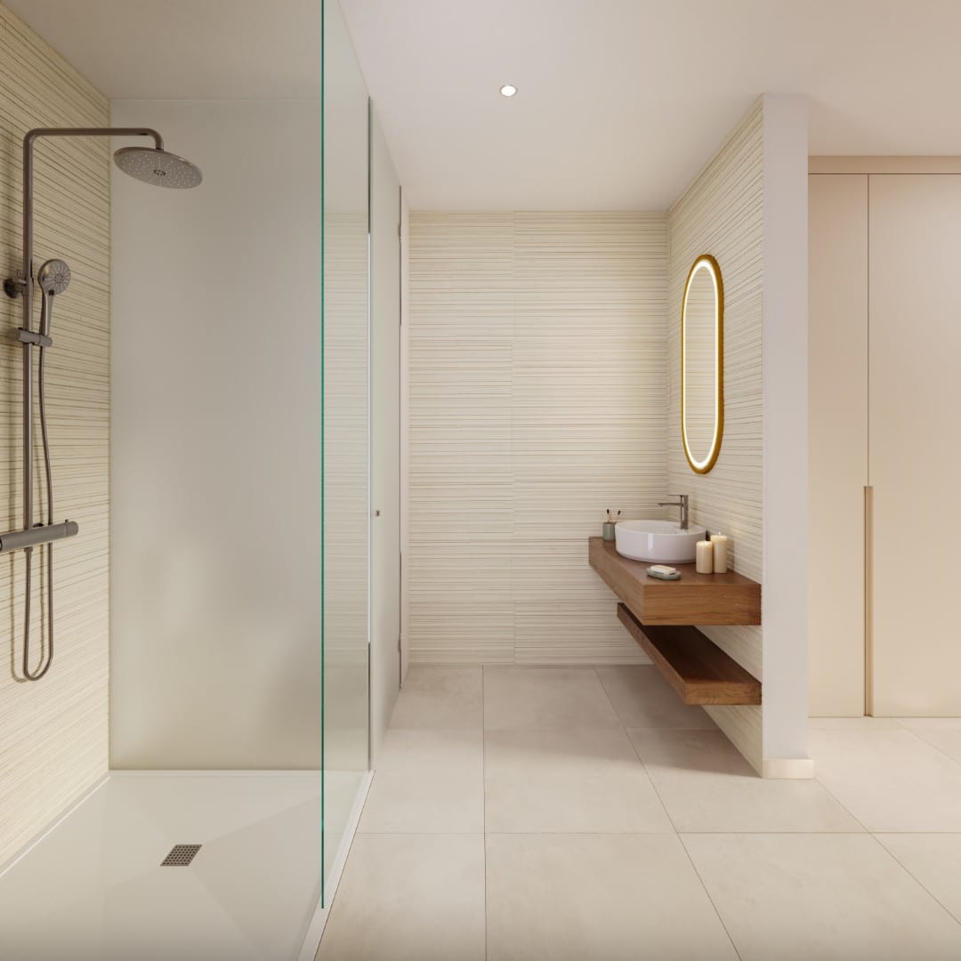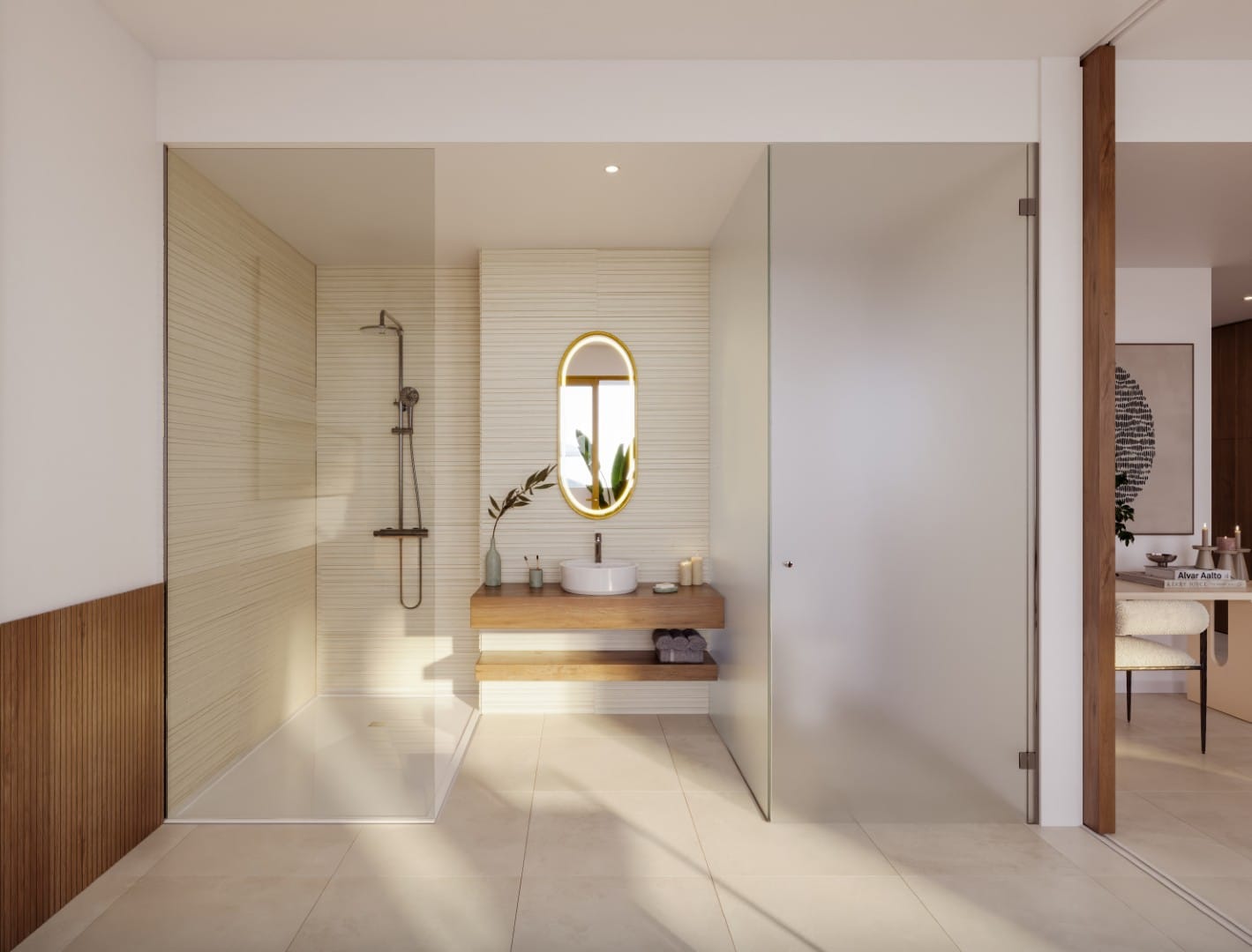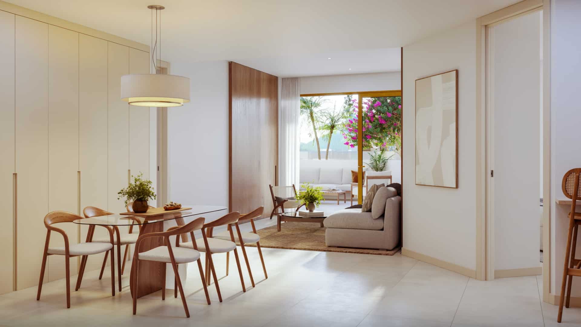 Im Inneren verfügen die Wohnungen über offene Grundrisse, voll ausgestattete Küchen, moderne Bäder mit hochwertigen Oberflächen, fortschrittliche Klimatisierungssysteme und flexible Schiebewände, die es ermöglichen, Räume als Arbeitszimmer oder Gästezimmer einzurichten.