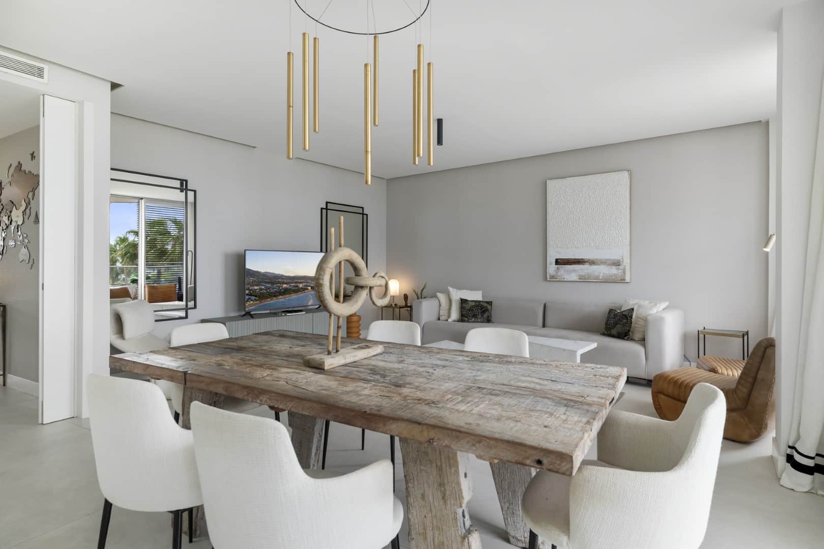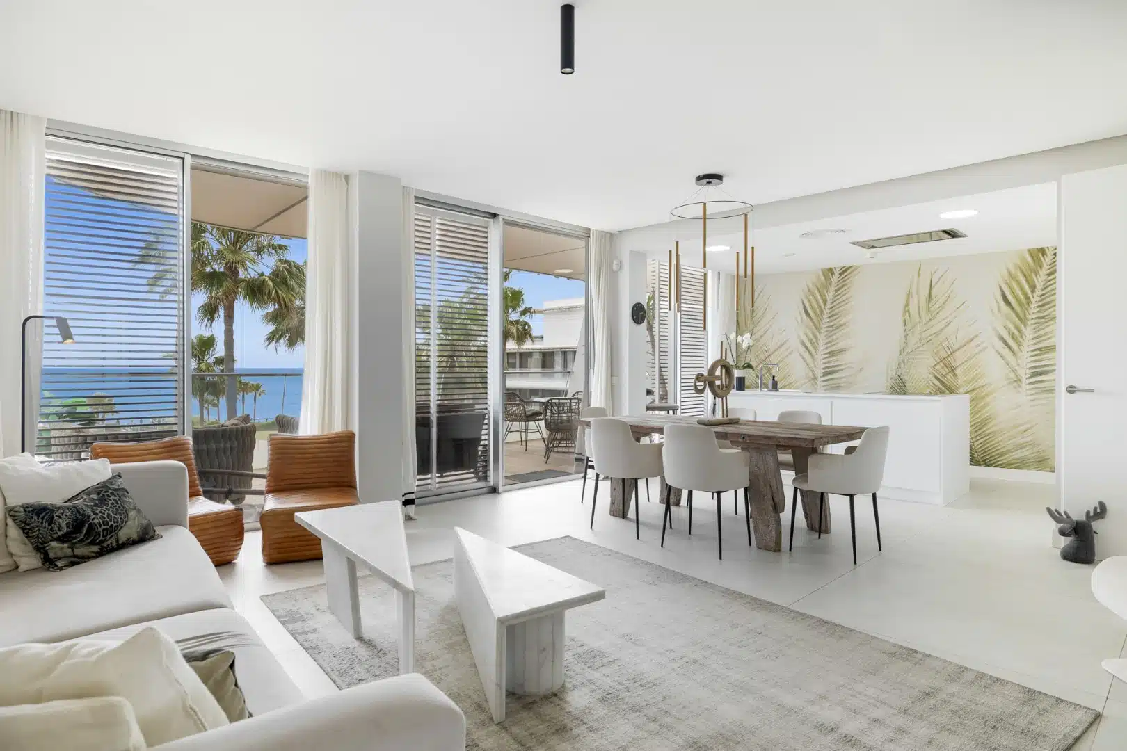 Welcome to a stunning 3-bedroom apartment located in the exclusive beachfront urbanisation The Edge, just west of Estepona. This home combines elegant contemporary design with an unbeatable location, offering panoramic views of the Mediterranean and first-class amenities. Just steps from the beach and within walking distance to local shops and restaurants, the apartment is also only a 5–10 minute drive to the vibrant Estepona port and charming town centre. The spacious living and dining area is bathed in natural light and seamlessly connected to a sleek, fully fitted open-plan kitchen. The master suite features a private dressing area and en-suite bathroom, while two guest bedroo...