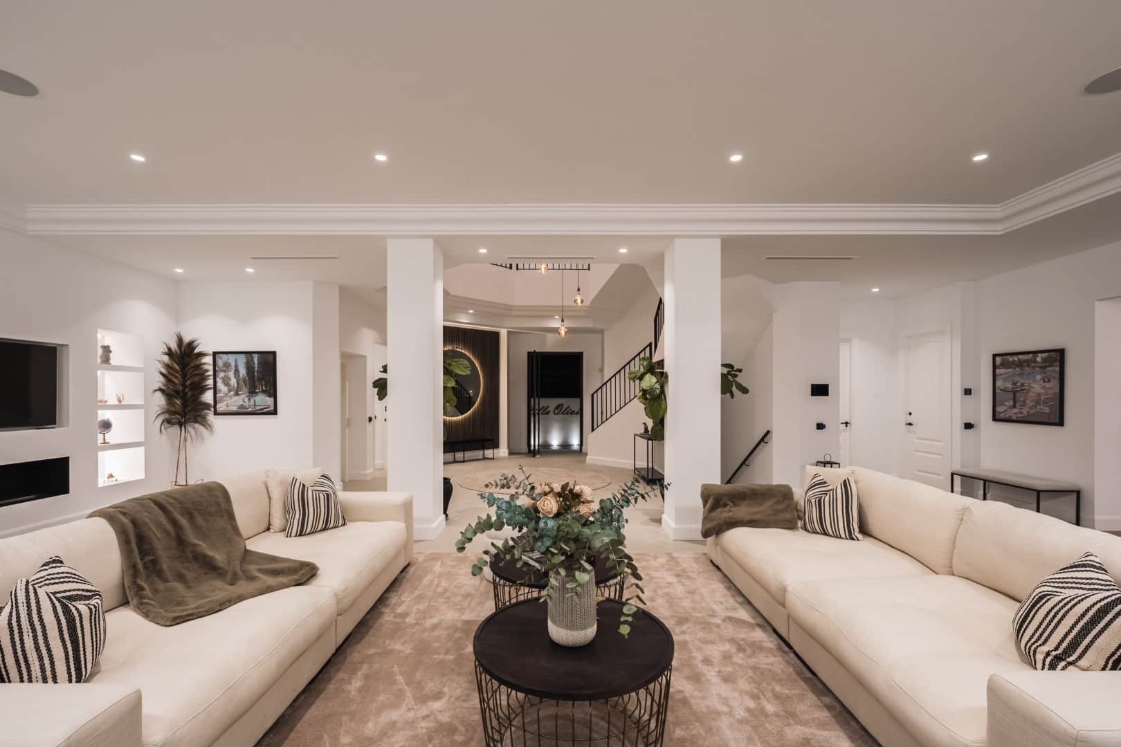 Spanning over four levels, an elevator provides convenient access across all floors. Villa Olivia offers 6 generously sized bedrooms, 7 bathrooms, 3 swimming pools, a cinema room, office spaces, a spa, a gym, a wine cellar, and a stunning rooftop terrace with panoramic views.