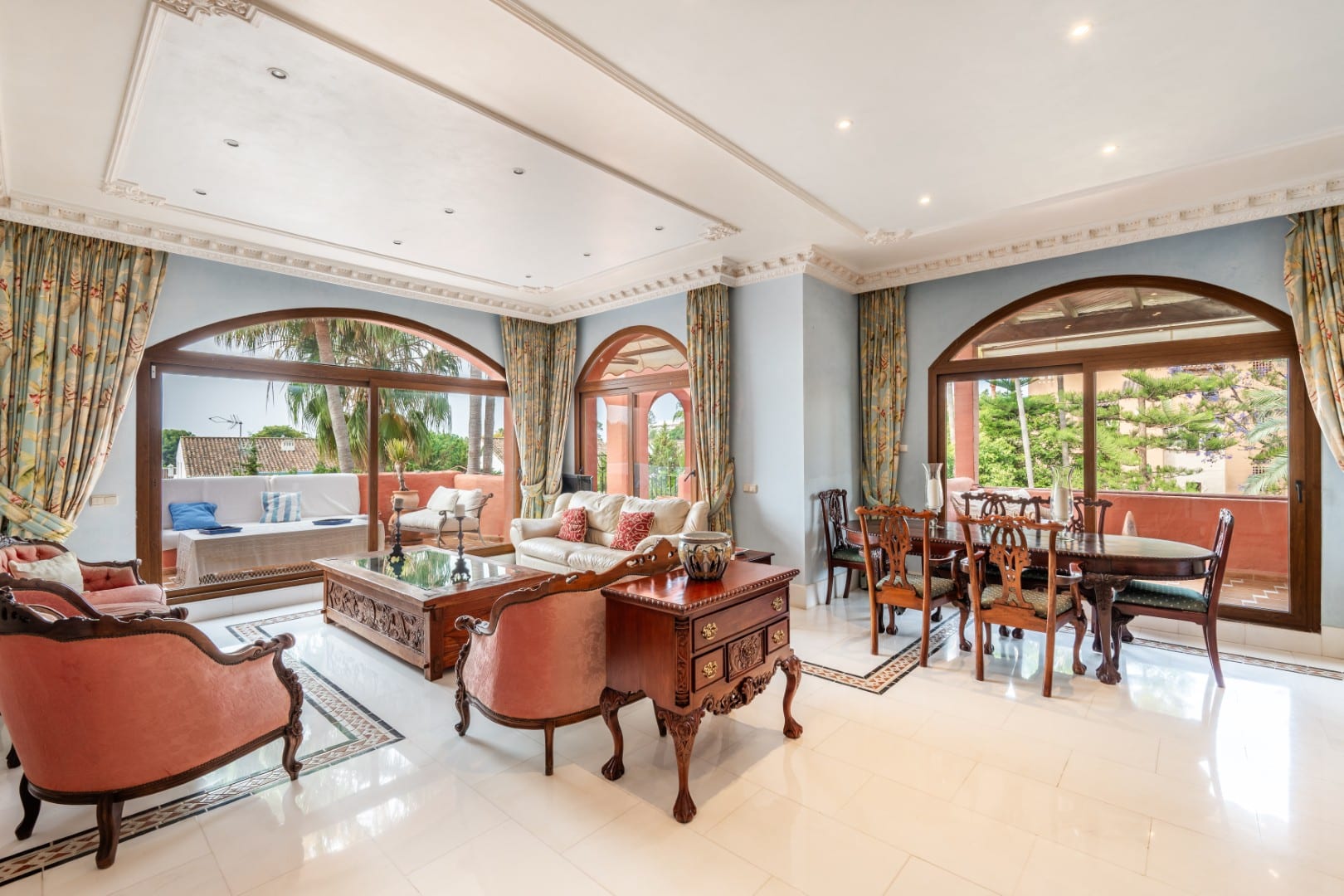 This duplex penthouse is set in gated community of Alhambra del Golf in Guadalmina Baja. Combining two units into one, the layout extends across two levels, with private lift access, a rooftop pool, and multiple terraces. The building has only 28 residences, ensuring a quiet setting with 24-hour security and landscaped communal areas, including a pool.