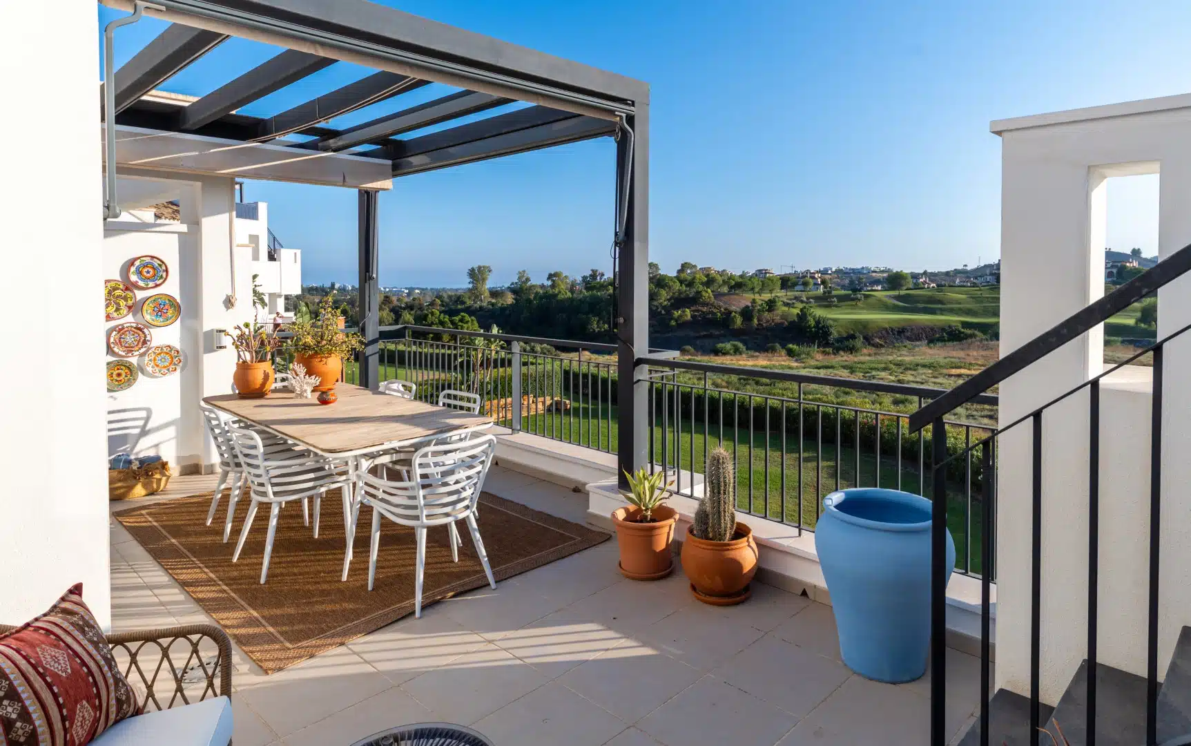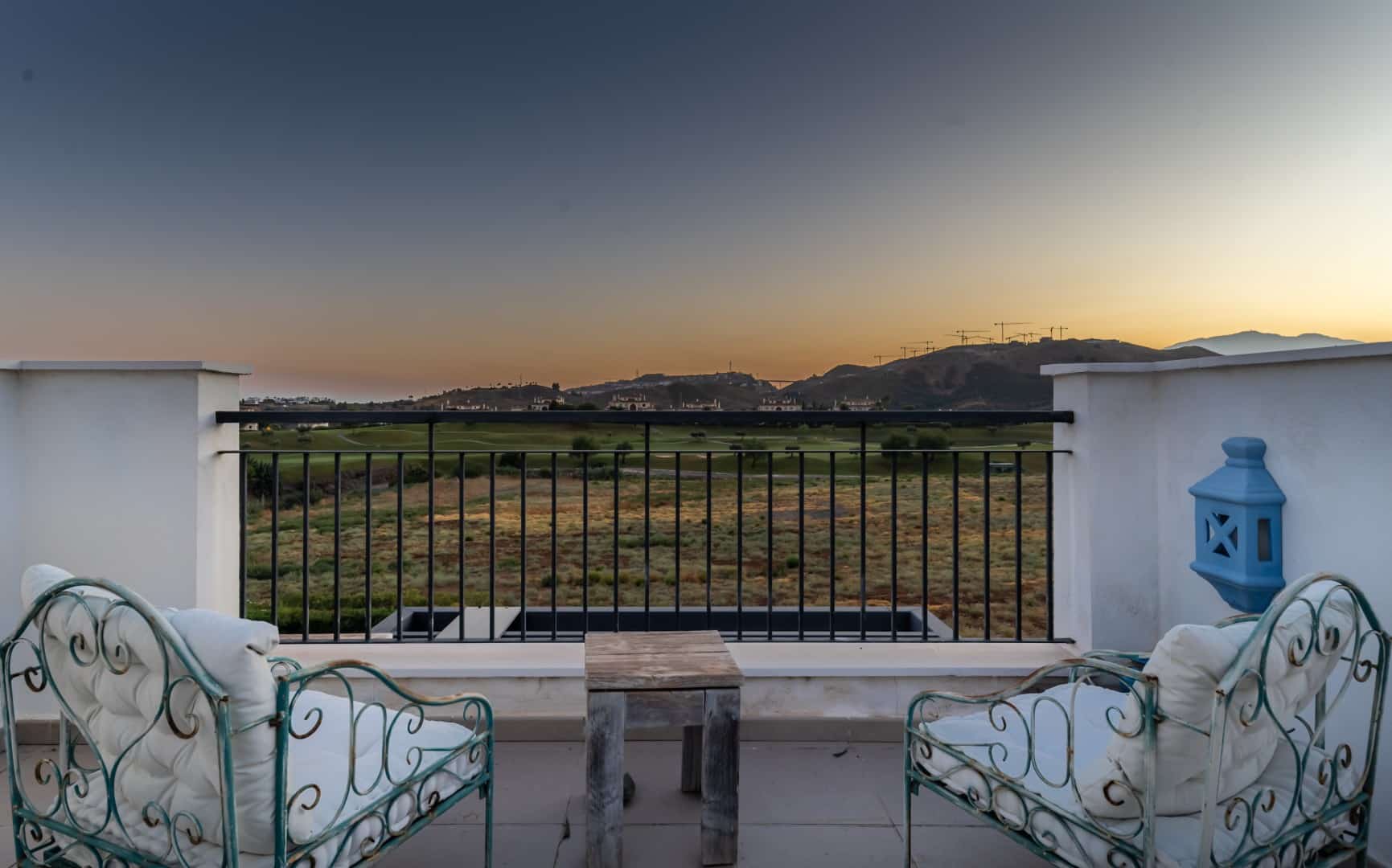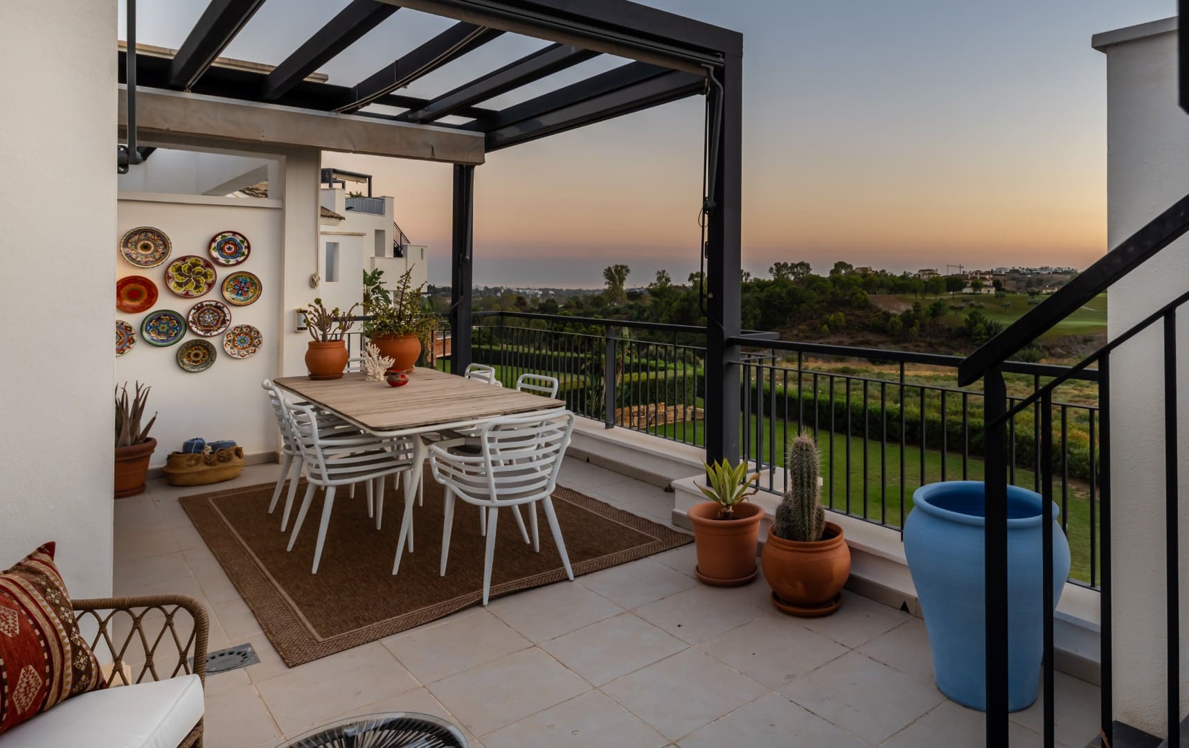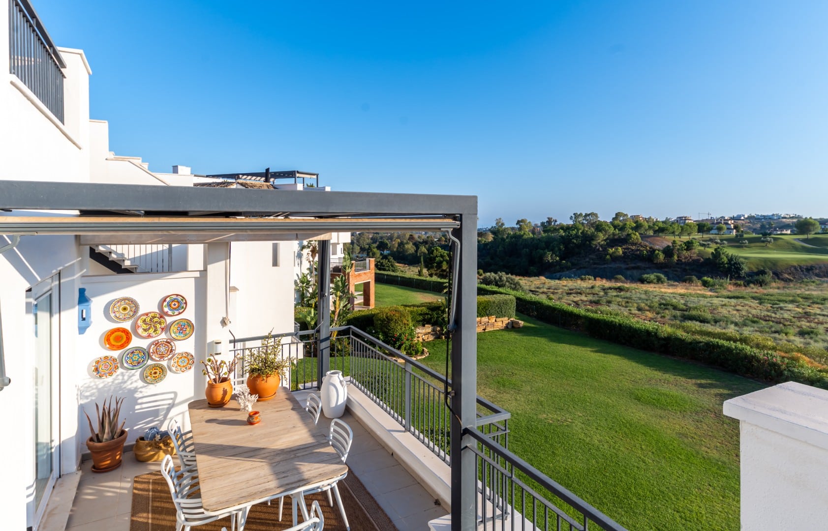 This frontline golf 3-bedroom duplex penthouse in Los Robles Los Arqueros, with its southwest orientation has outstanding views of the El Higueral golf course and the Mediterranean Sea.