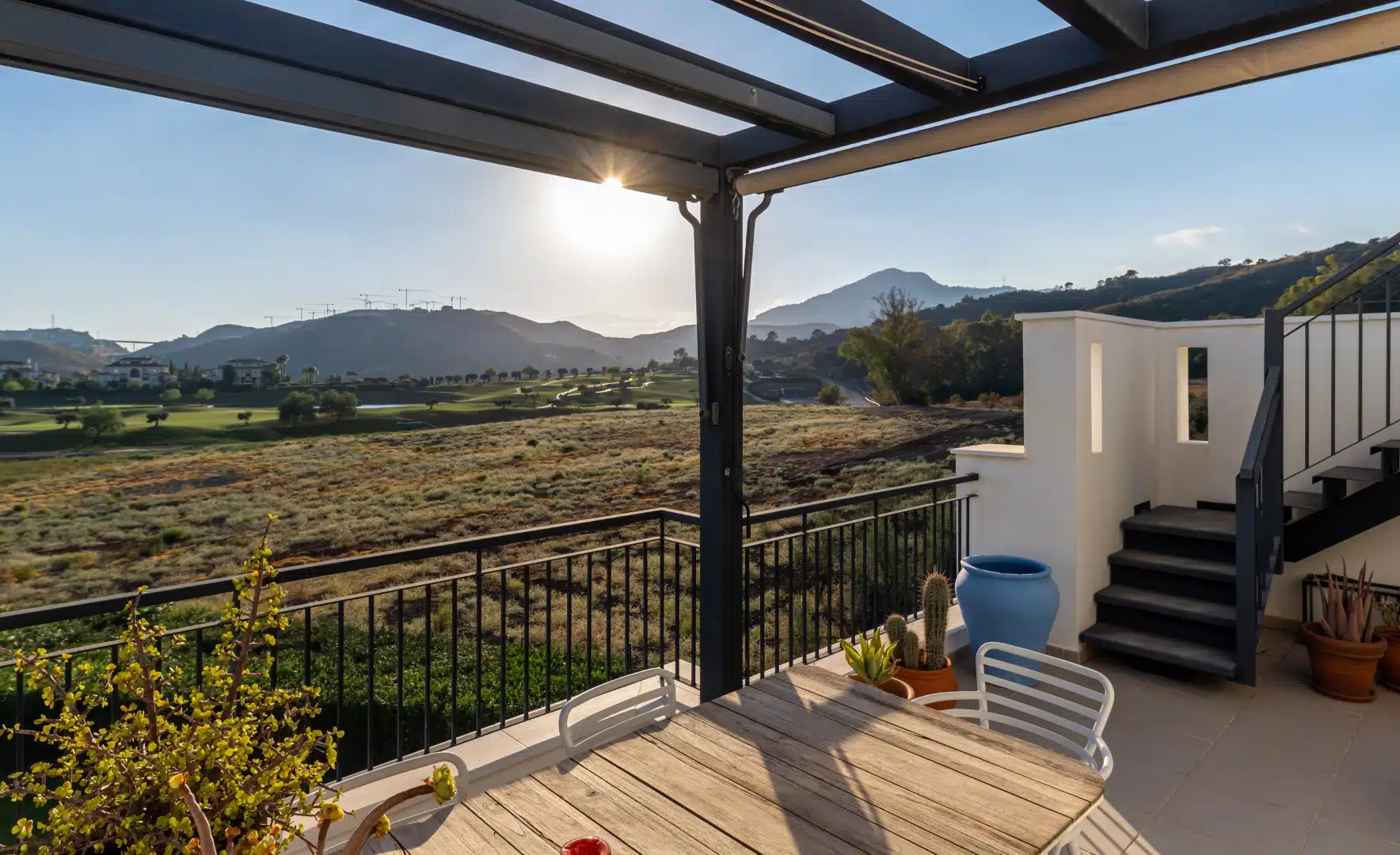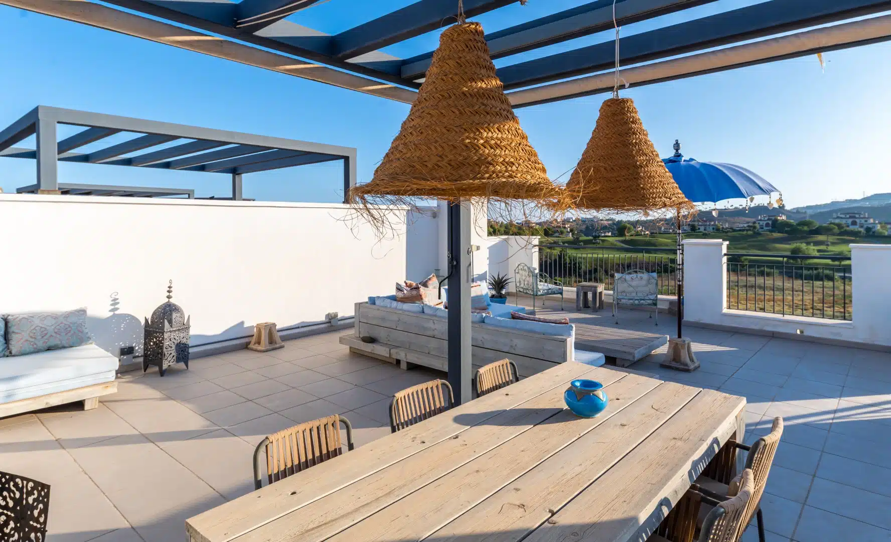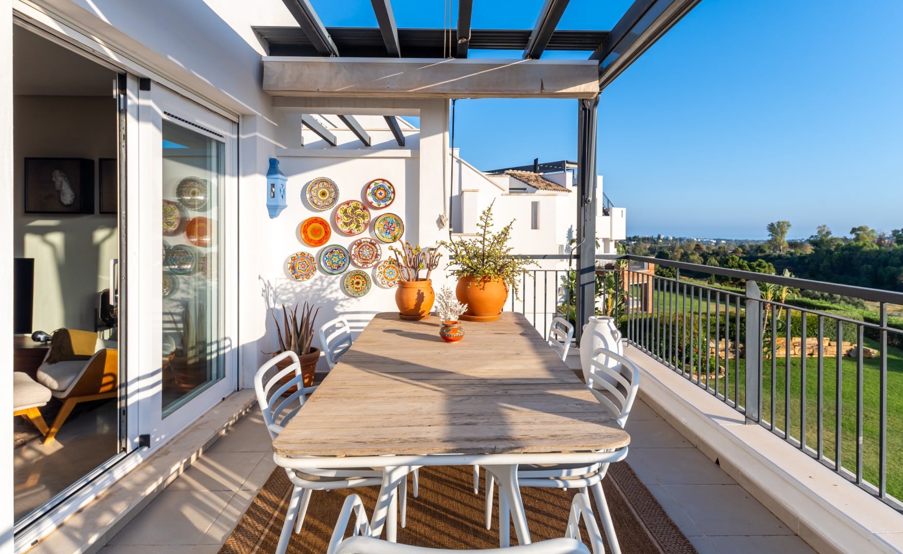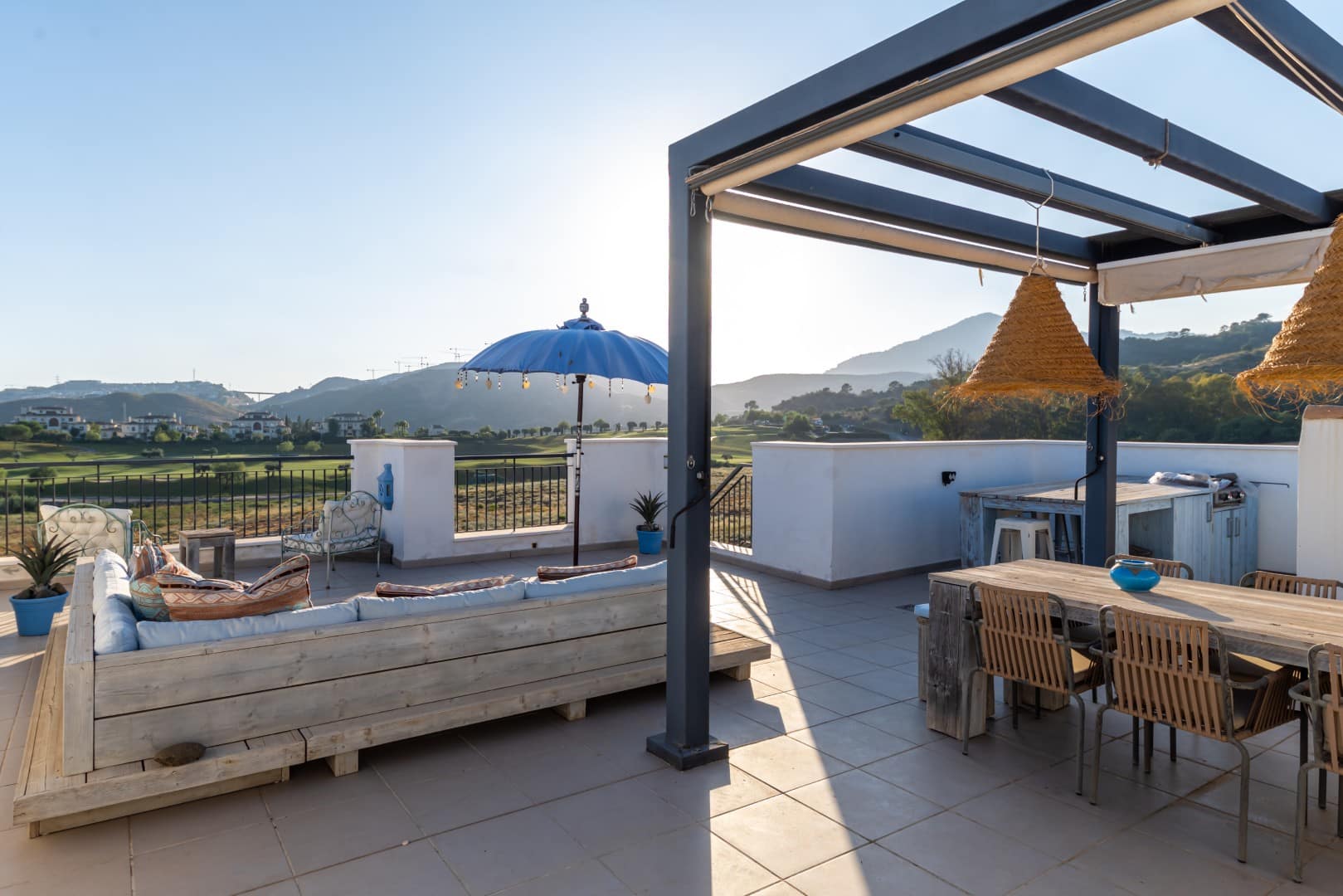 This frontline golf 3-bedroom duplex penthouse in Los Robles Los Arqueros, with its southwest orientation has outstanding views of the El Higueral golf course and the Mediterranean Sea.