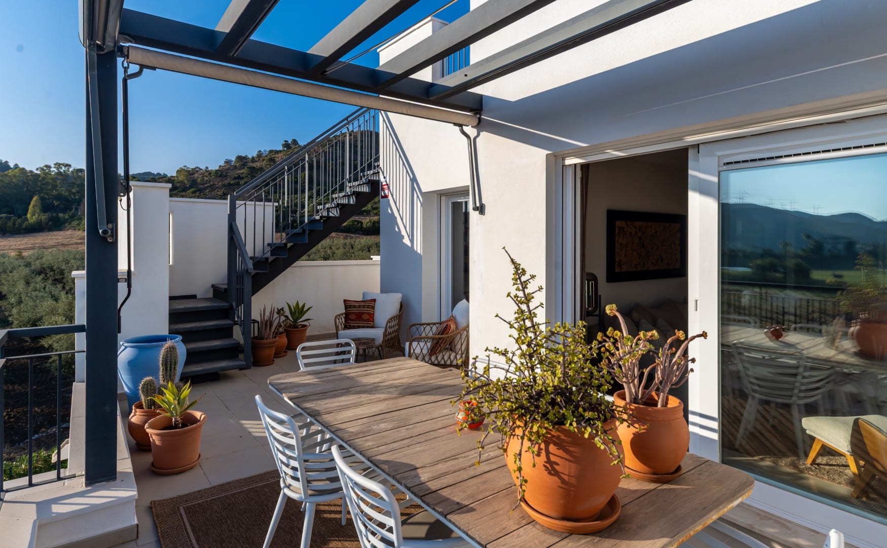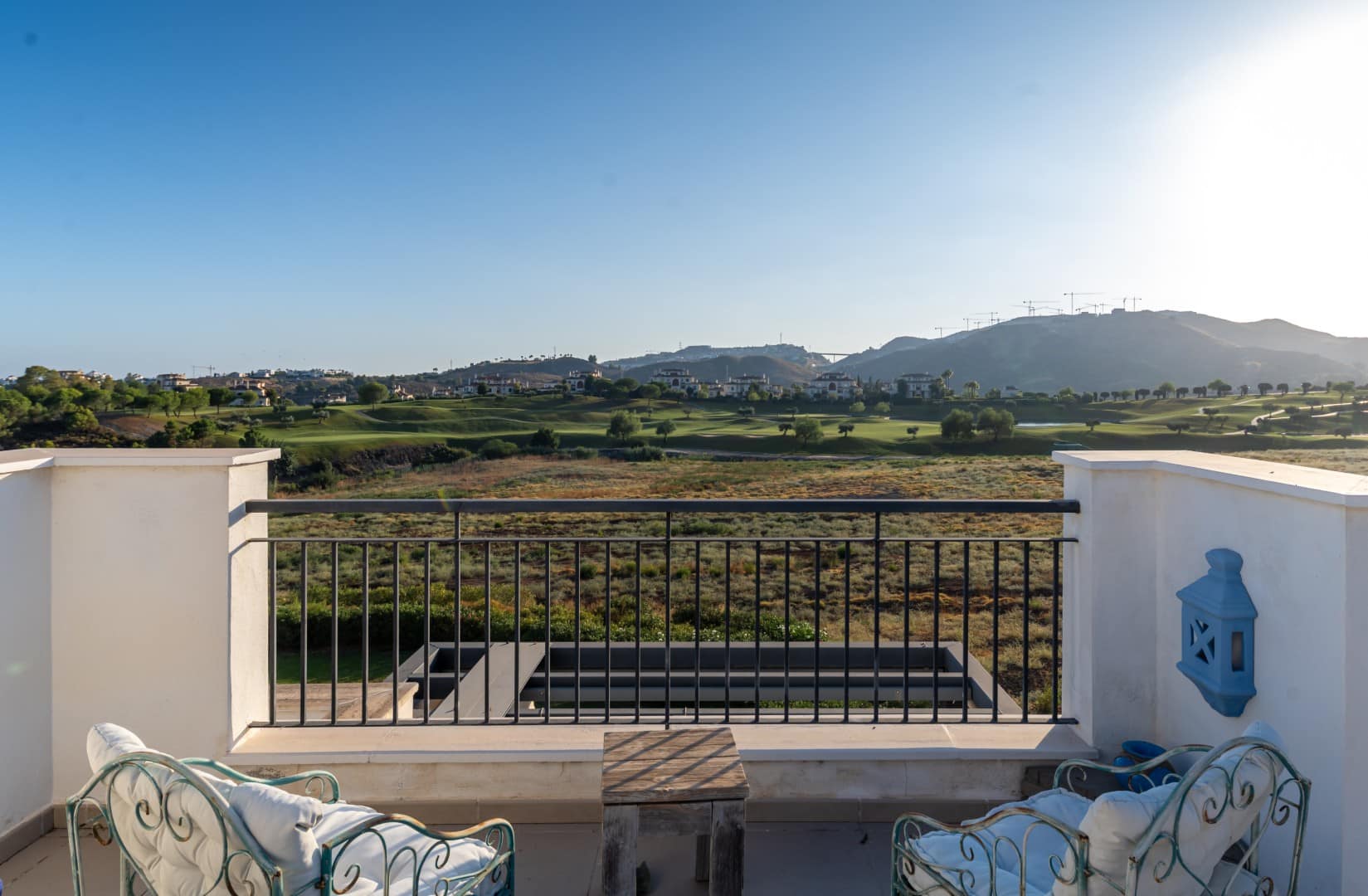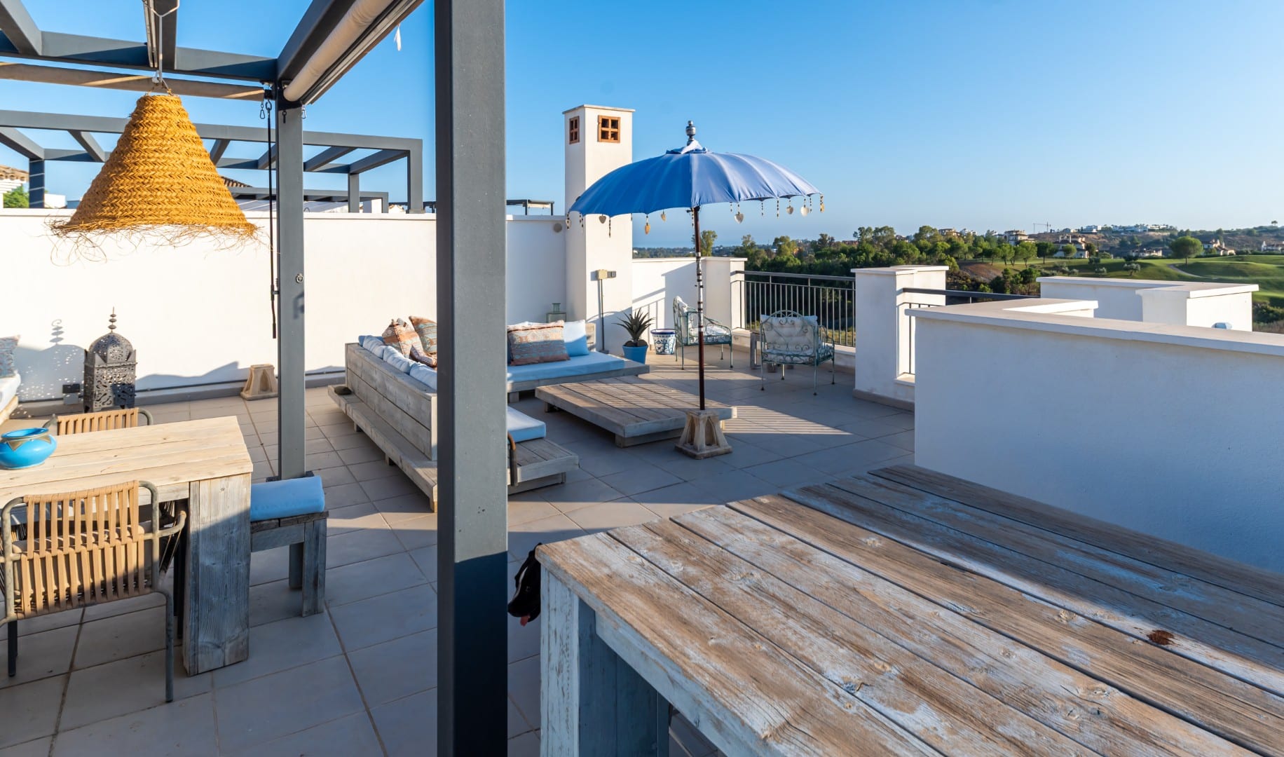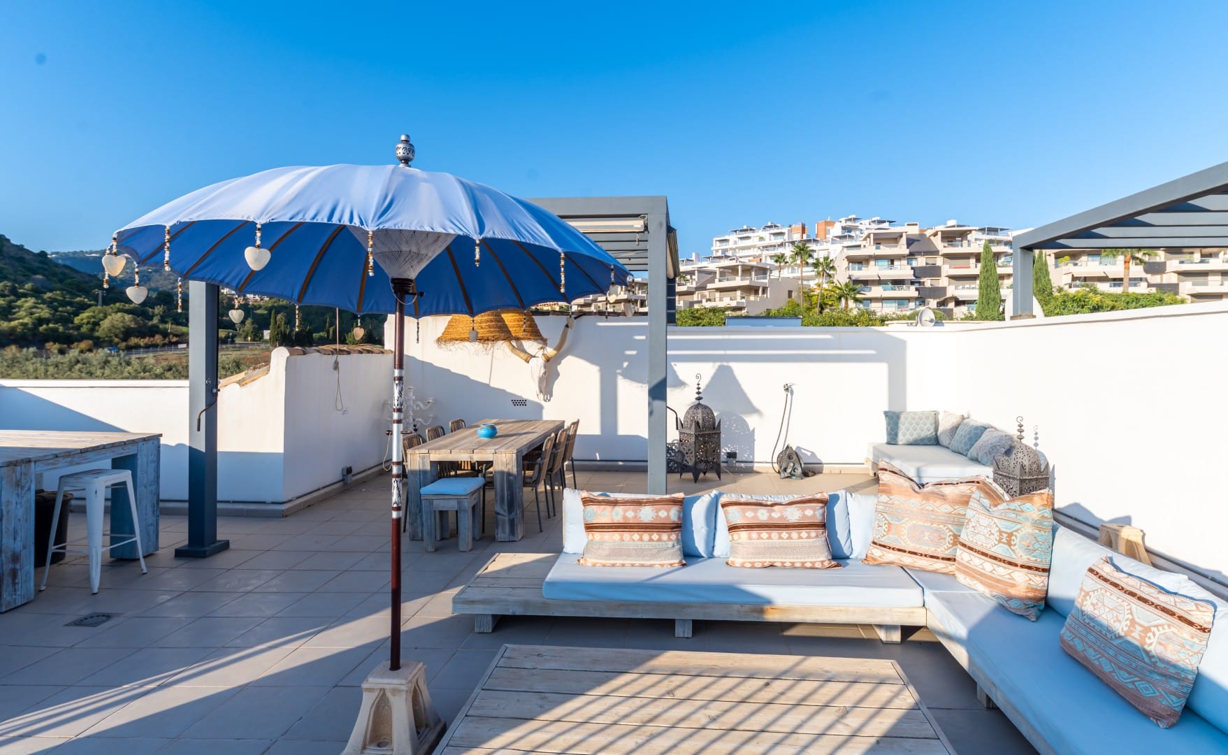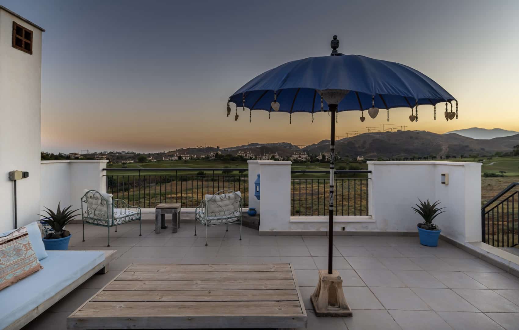 This frontline golf 3-bedroom duplex penthouse in Los Robles Los Arqueros, with its southwest orientation has outstanding views of the El Higueral golf course and the Mediterranean Sea.
