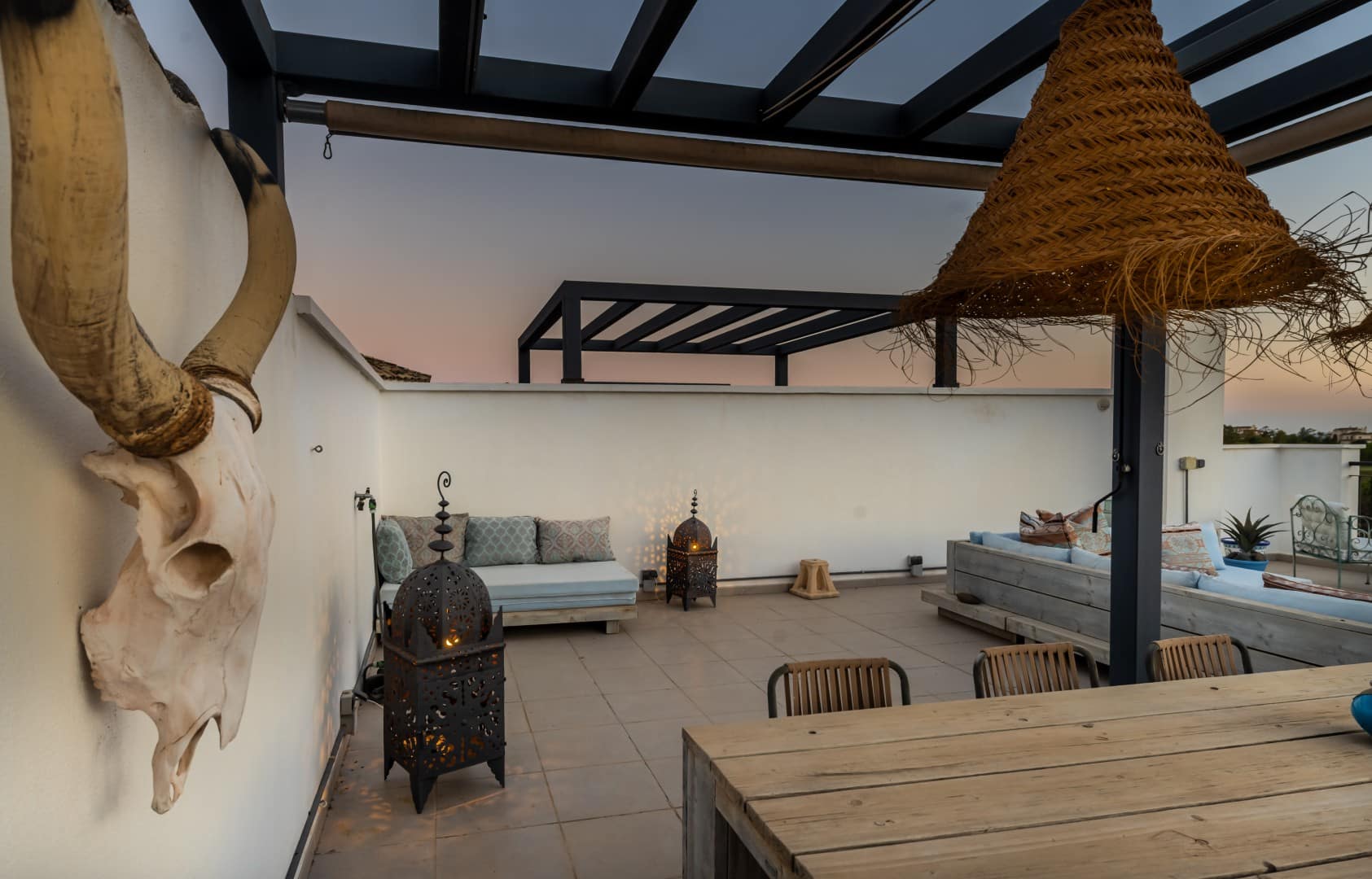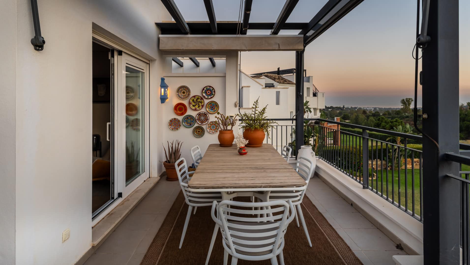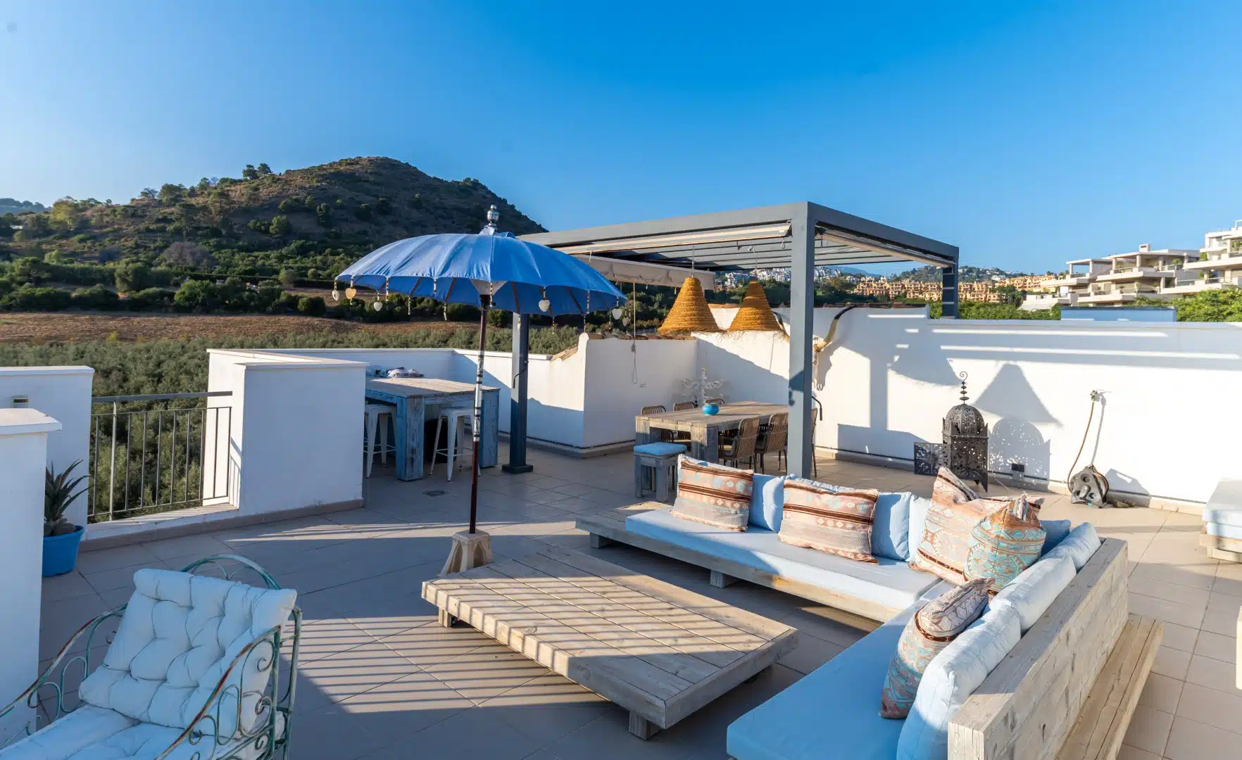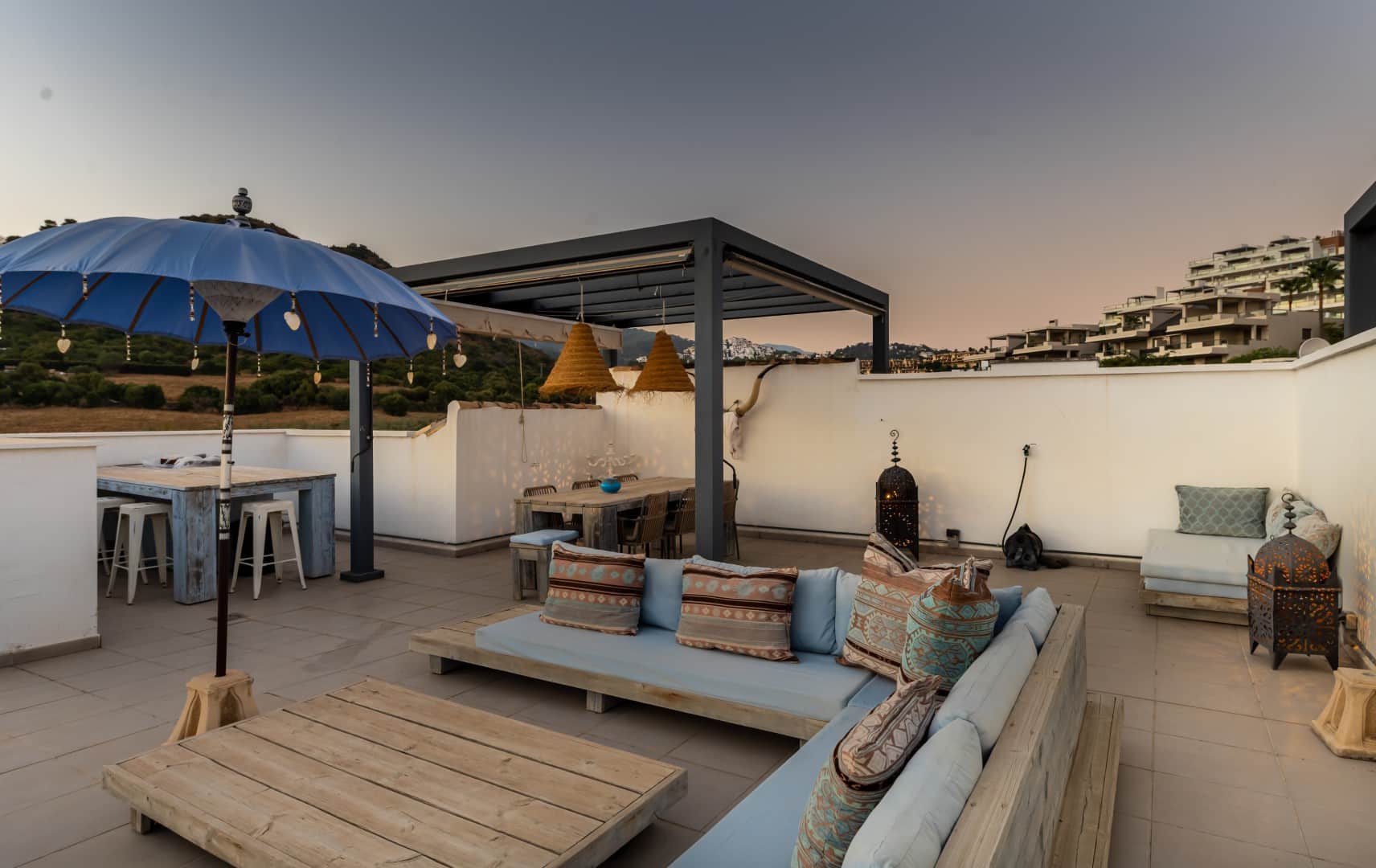 This frontline golf 3-bedroom duplex penthouse in Los Robles Los Arqueros, with its southwest orientation has outstanding views of the El Higueral golf course and the Mediterranean Sea.