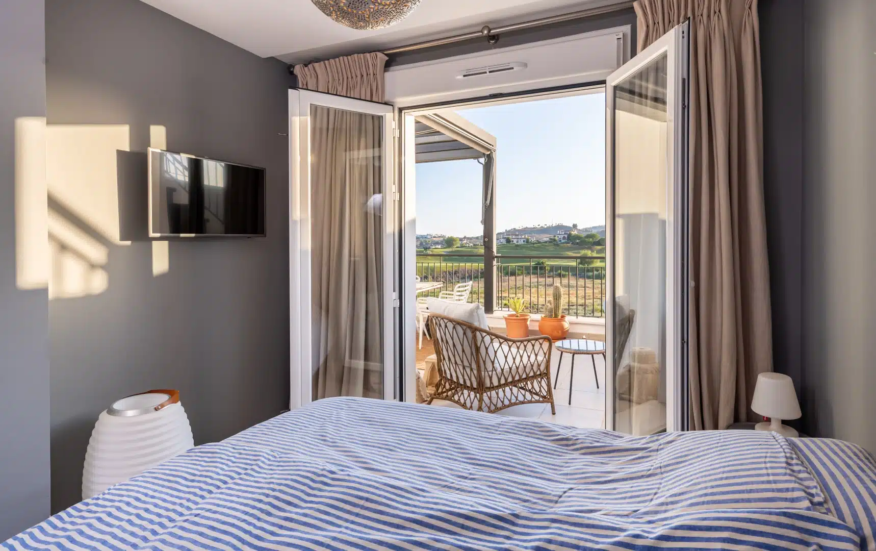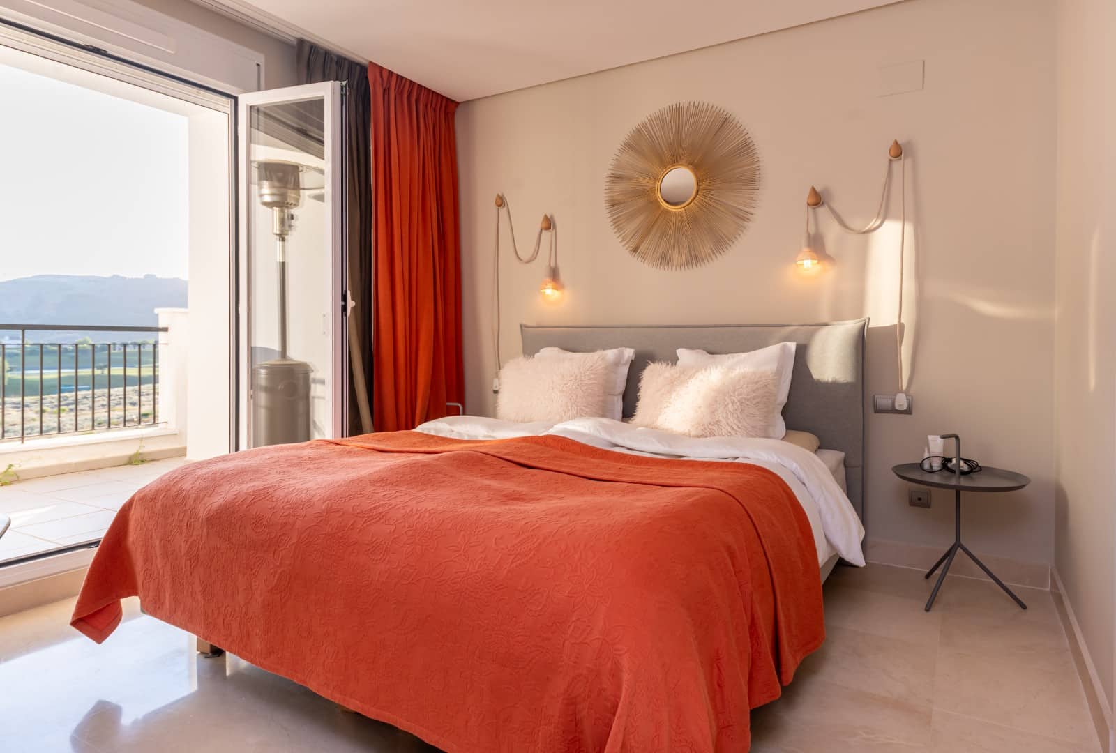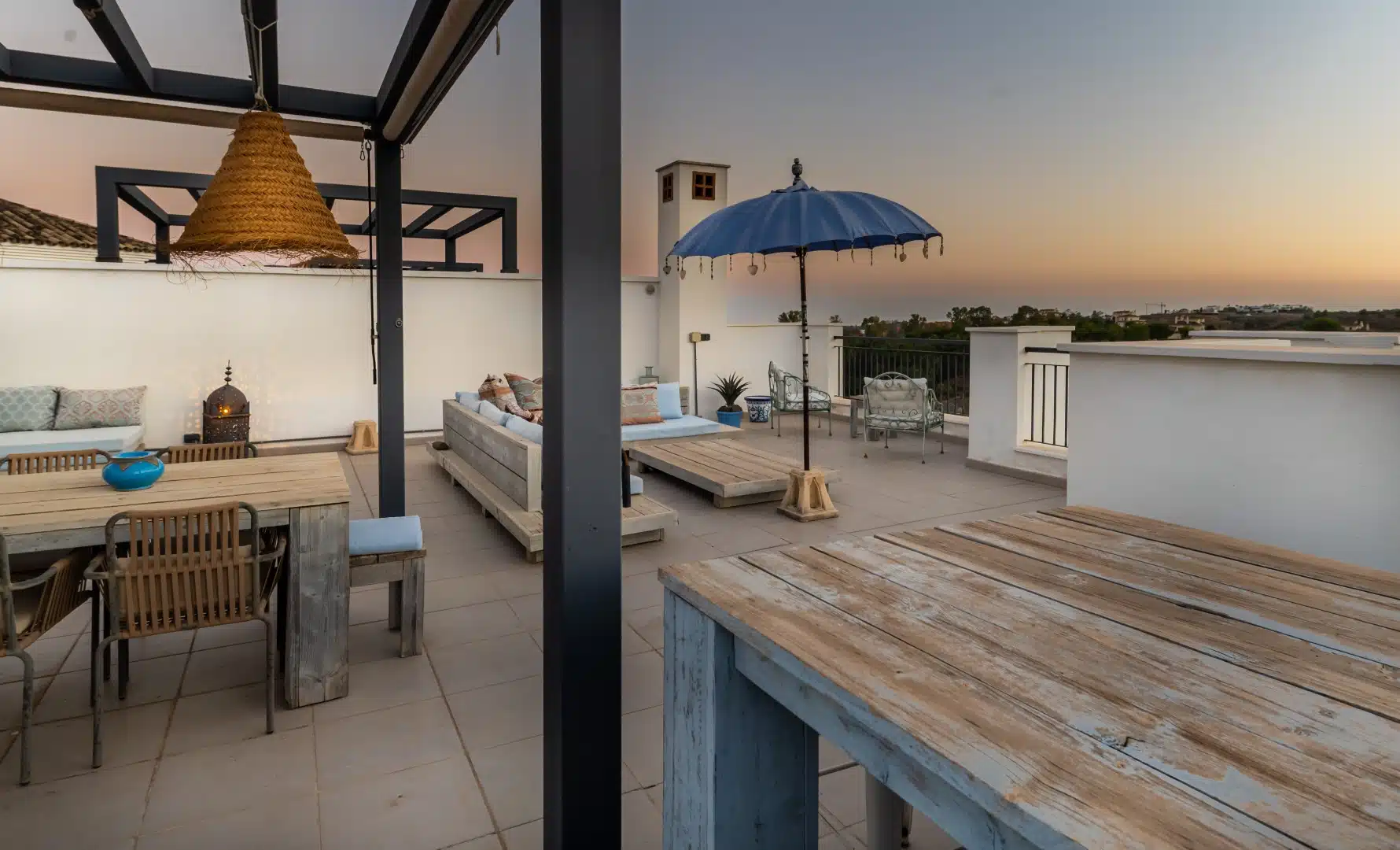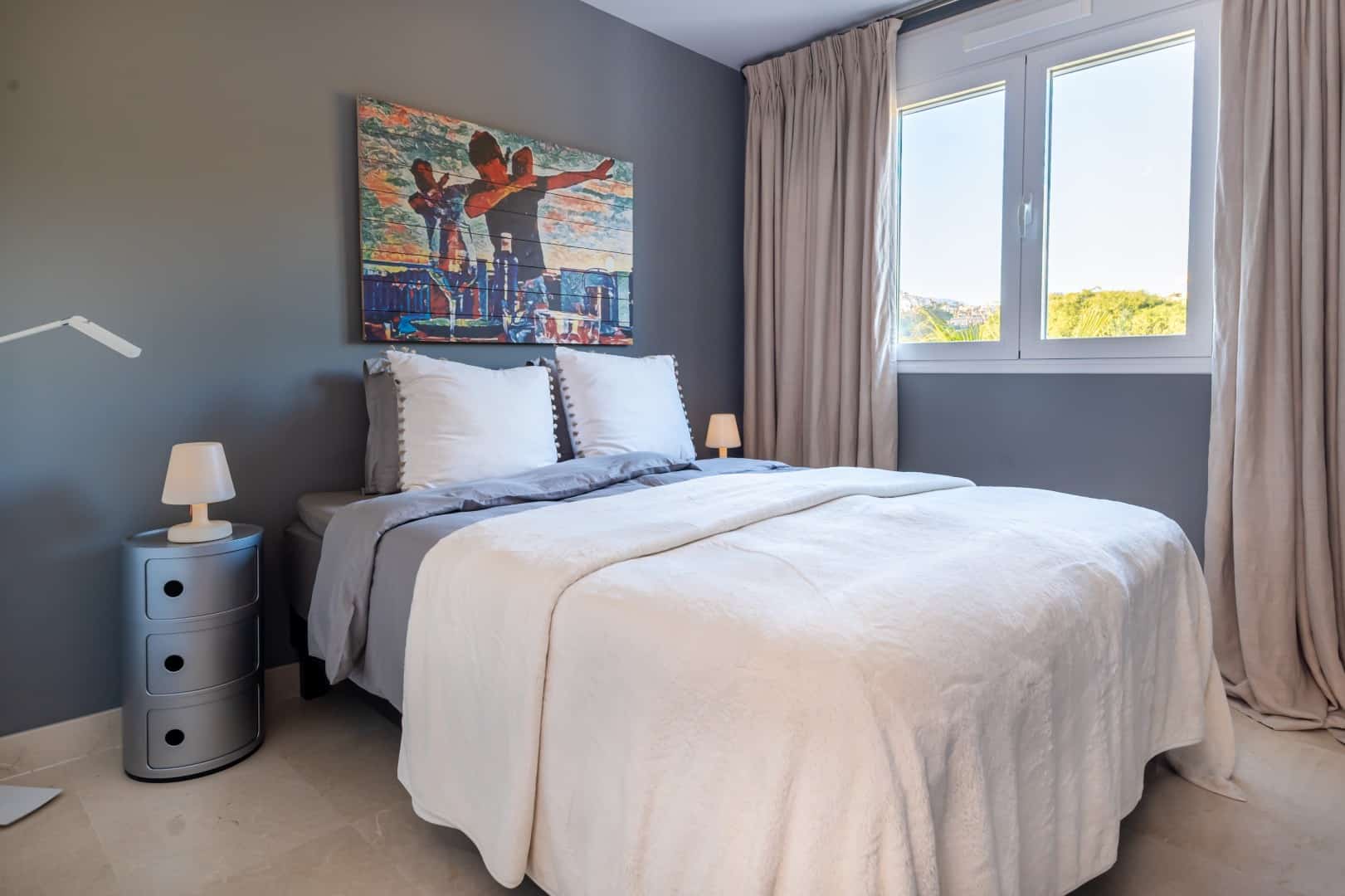 This frontline golf 3-bedroom duplex penthouse in Los Robles Los Arqueros, with its southwest orientation has outstanding views of the El Higueral golf course and the Mediterranean Sea.