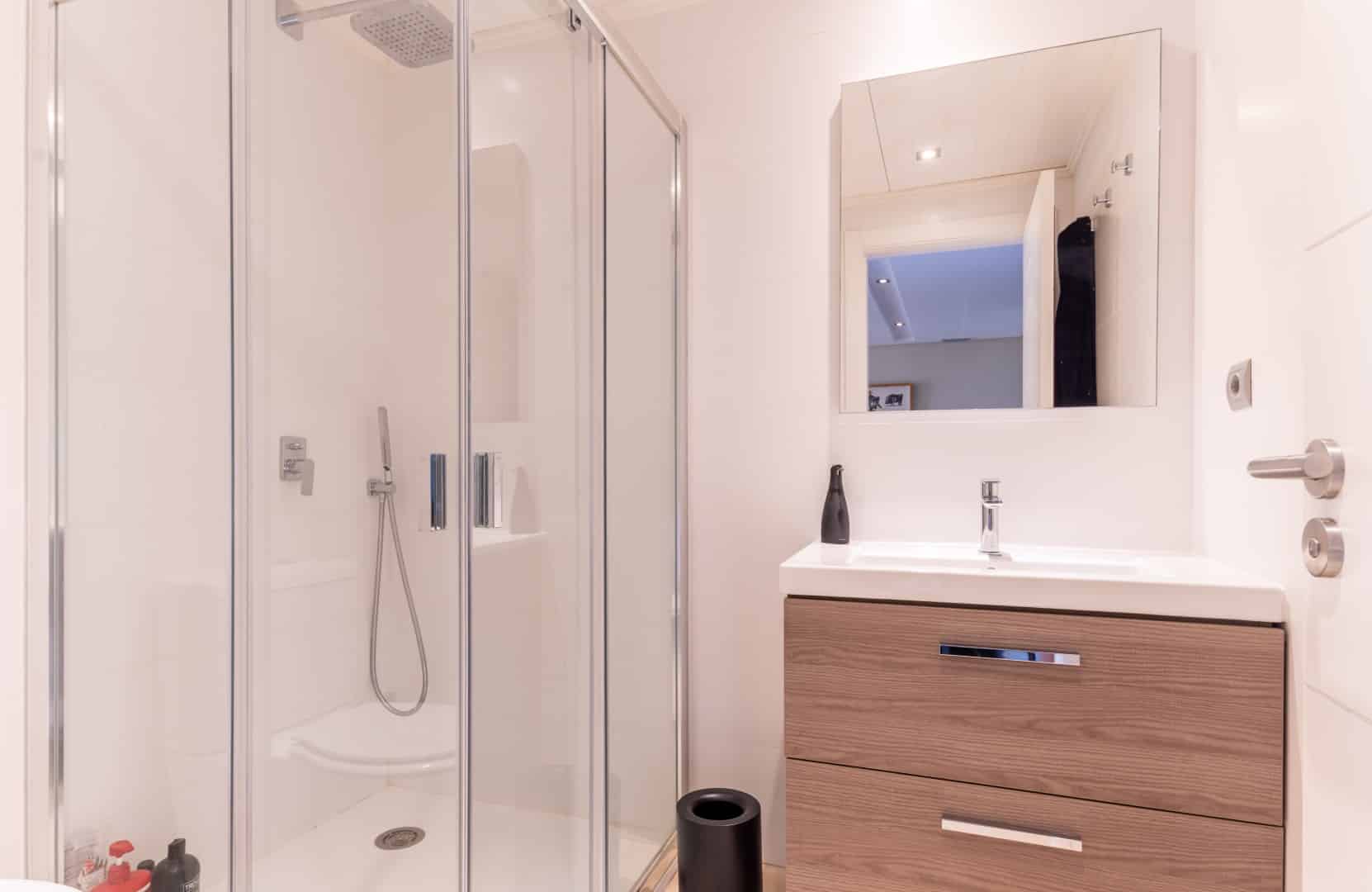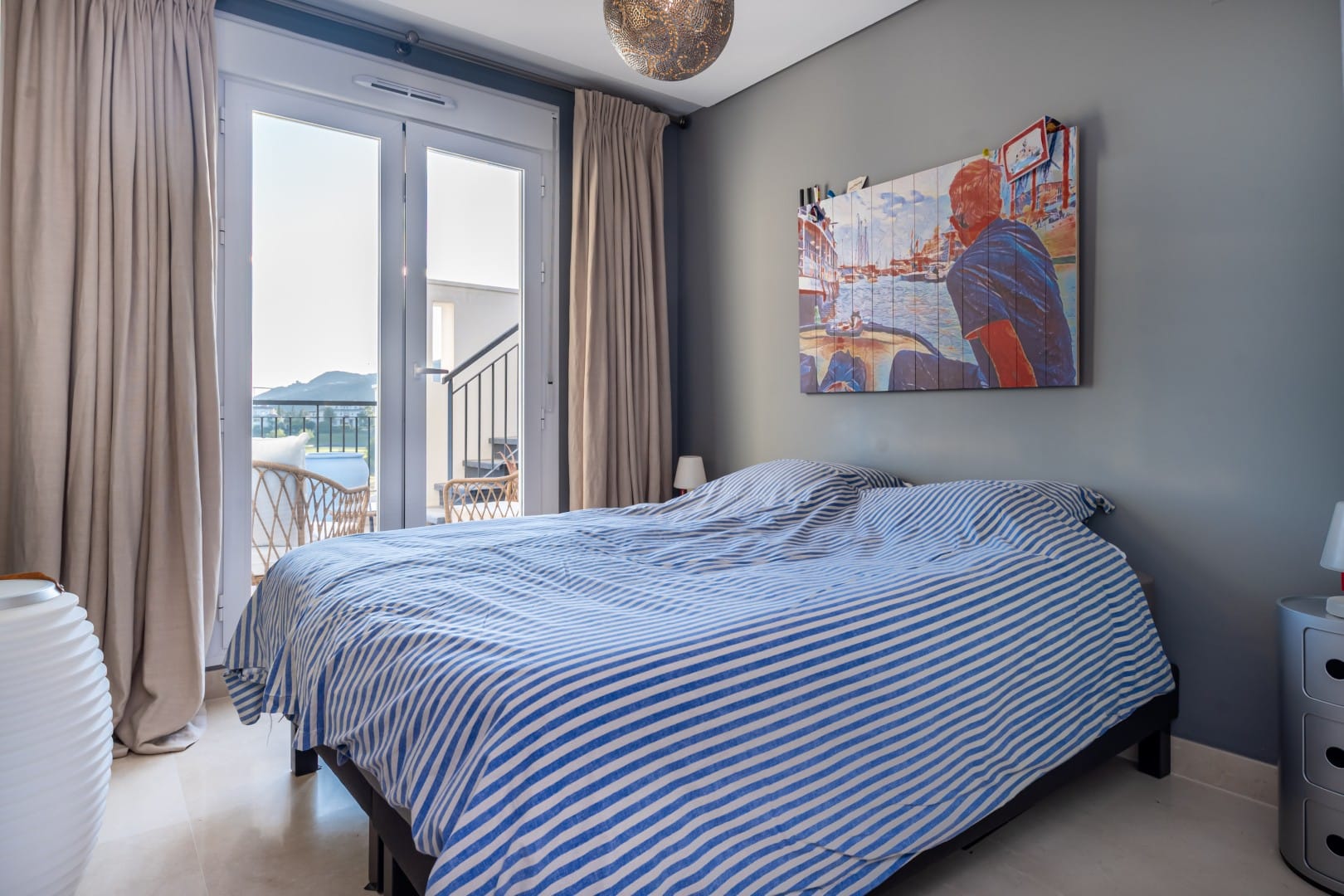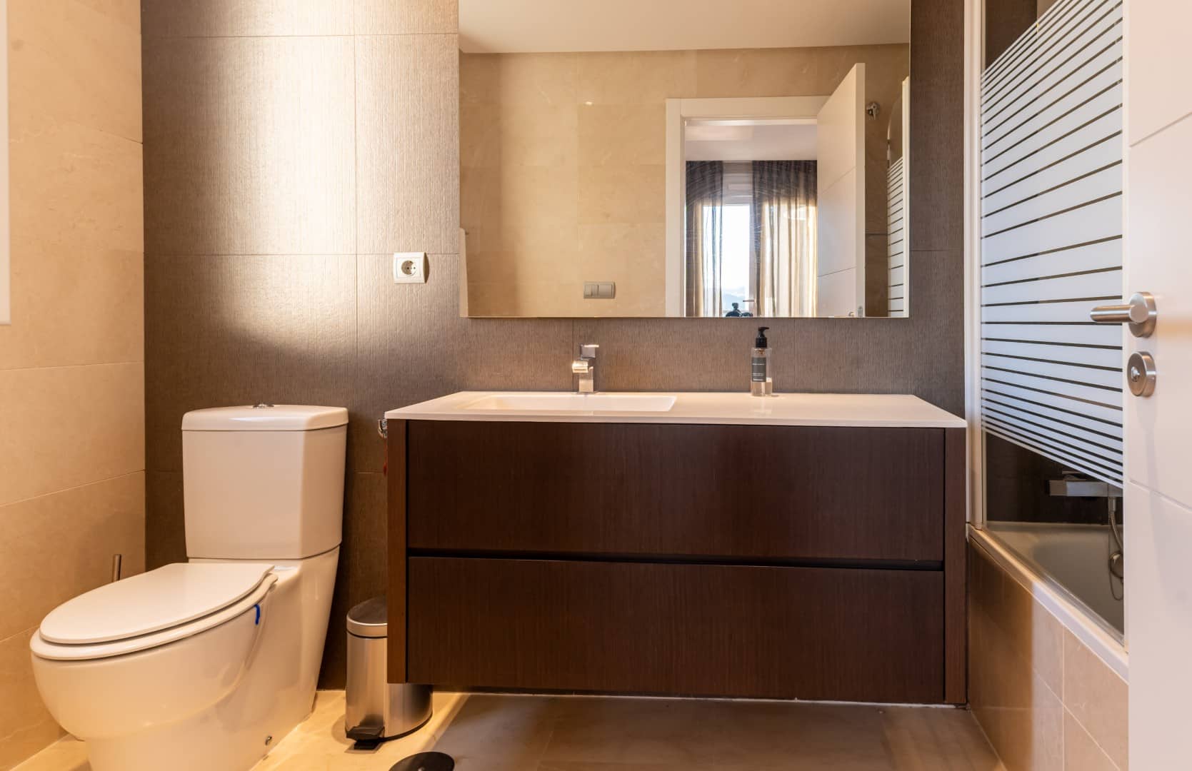 The master bedroom offers an en-suite bathroom, fully fitted wardrobes and benefits from access to the terrace. Both the guest bedroom suites, of which one offers access to the main terrace share a bathroom with walk-in shower.