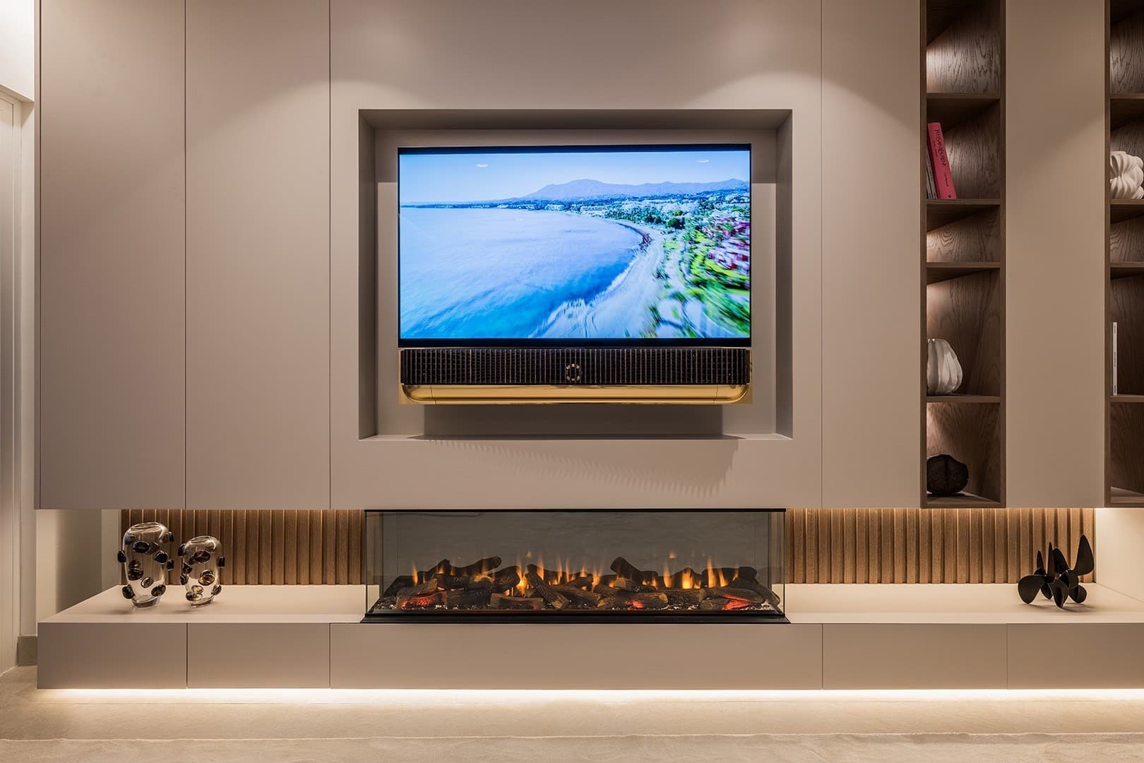 This four-bedroom, three-bathroom apartment has been meticulously upgraded to the highest standards. The open-plan layout centres around a designer kitchen equipped with top-tier German appliances, an invisible induction hob and a built-in wine fridge. A second kitchen offers added practicality, ideal for hosting or private catering. Sleek flooring flows throughout, leading to a spacious living area with a contemporary electric fireplace and integrated Bang & Olufsen sound system, perfect for both relaxation and entertaining.