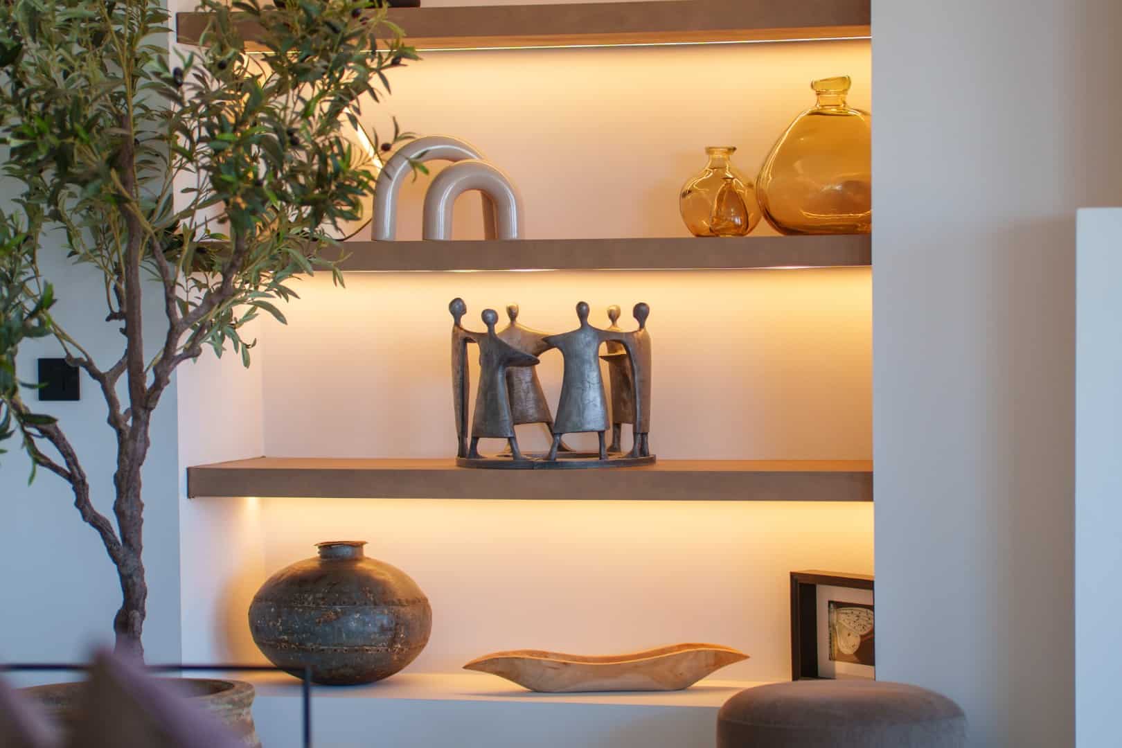 The interior design is a harmonious fusion of sophistication and warmth, combining neutral tones, natural textures, and bespoke furnishings to create a serene yet luxurious atmosphere. Handpicked décor pieces, artisanal lighting, and thoughtfully integrated shelving add character and charm, while large windows frame the captivating views and invite abundant daylight into every space. The result is a home that feels both contemporary and timeless, with a refined aesthetic that enhances its architectural beauty.