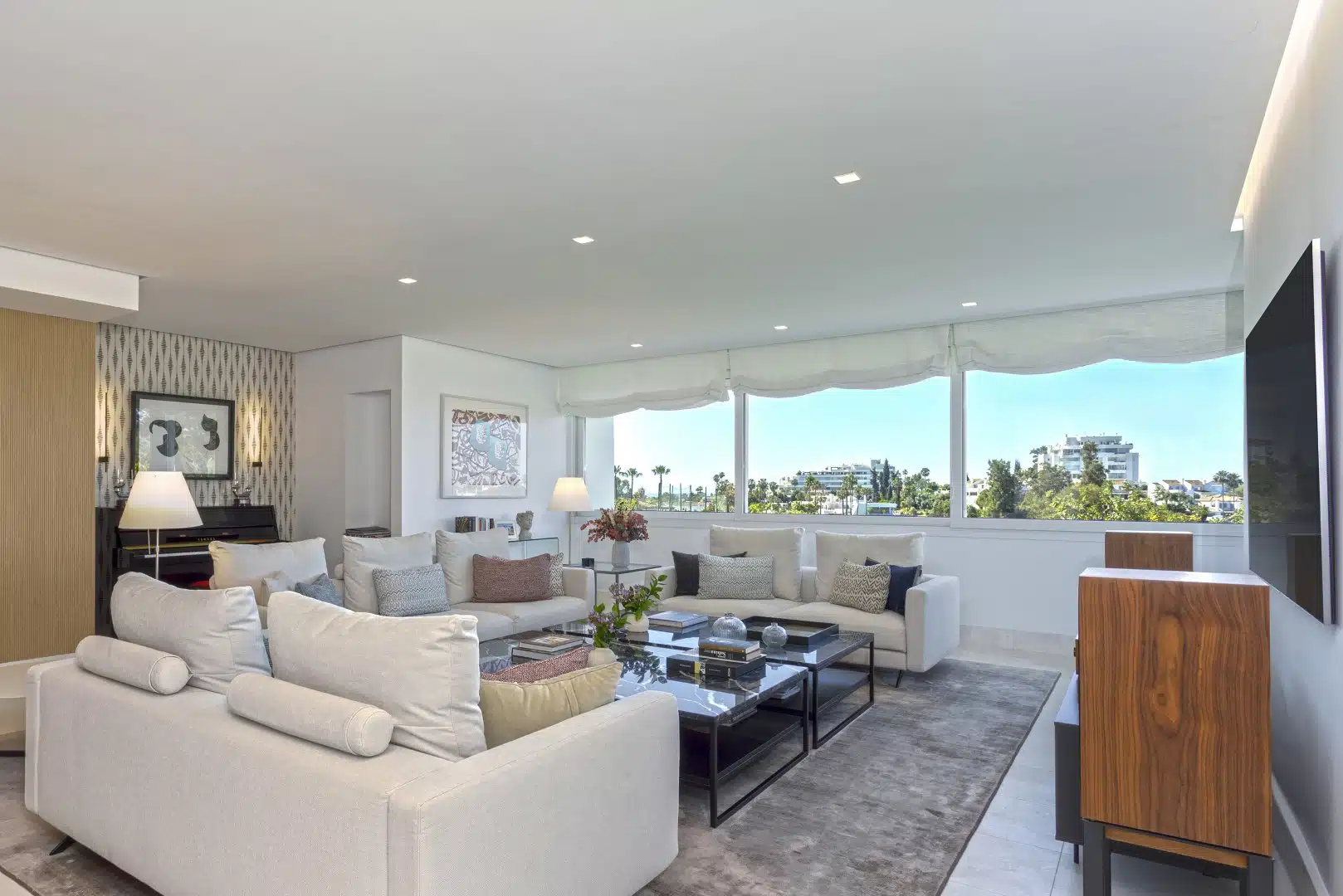 this bright and beautifully renovated two-bedroom, two-bathroom apartment is located in one of Guadalmina Alta’s frontline golf community. It offers a comfortable layout, timeless design, and partial sea views.