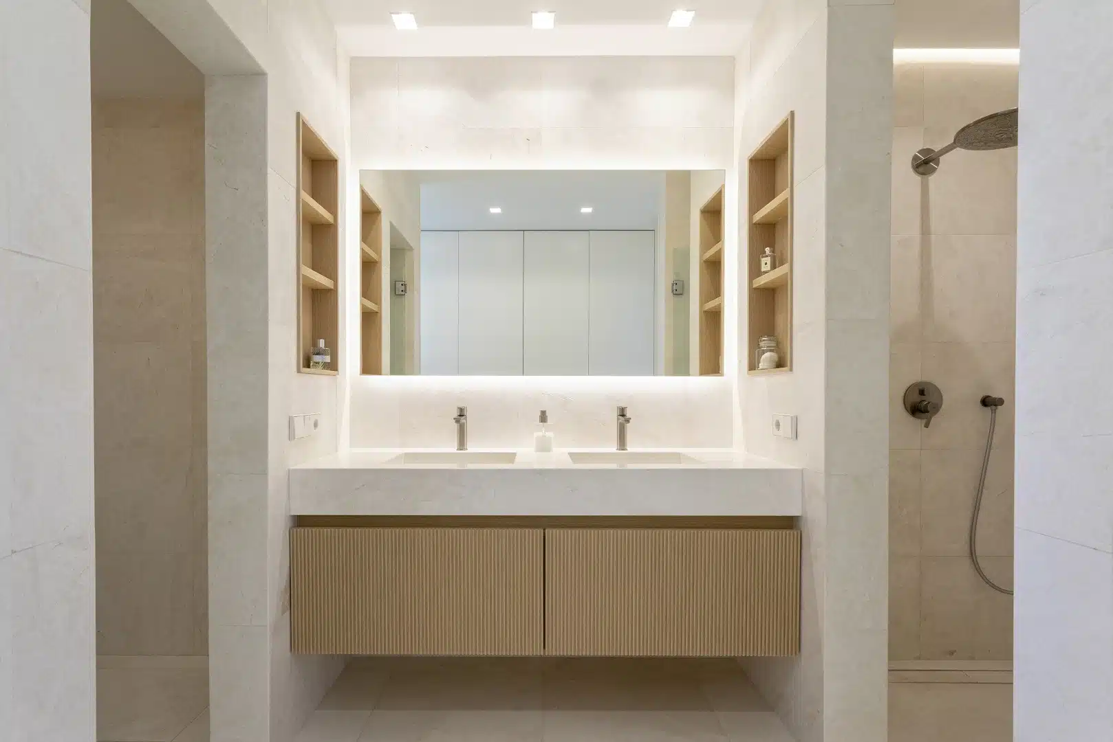 The main bedroom is generously sized and has direct access to the covered terrace, just like the living area—ideal for enjoying the outdoor space year-round. The bedroom includes an en-suite bathroom with a walk-in shower and double sinks, as well as a spacious wardrobe area conveniently integrated into the bathroom. The second bedroom features built-in wardrobes and is served by a second full bathroom, also with double sinks and a walk-in shower.