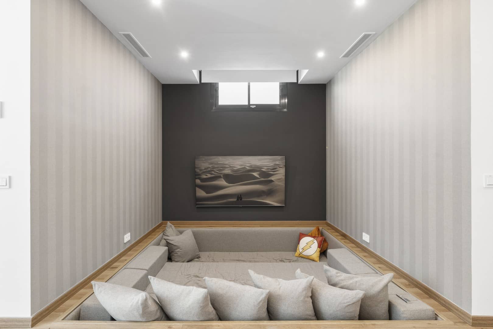 The ground floor’s contemporary kitchen allows for sociable cooking experiences, with easy interaction across the open-plan living spaces. The lower level features two bedrooms sharing a bathroom, cleverly designed to benefit from ample natural light and fresh air. This level also includes a dedicated TV lounge, perfect for quiet evenings or family entertainment.