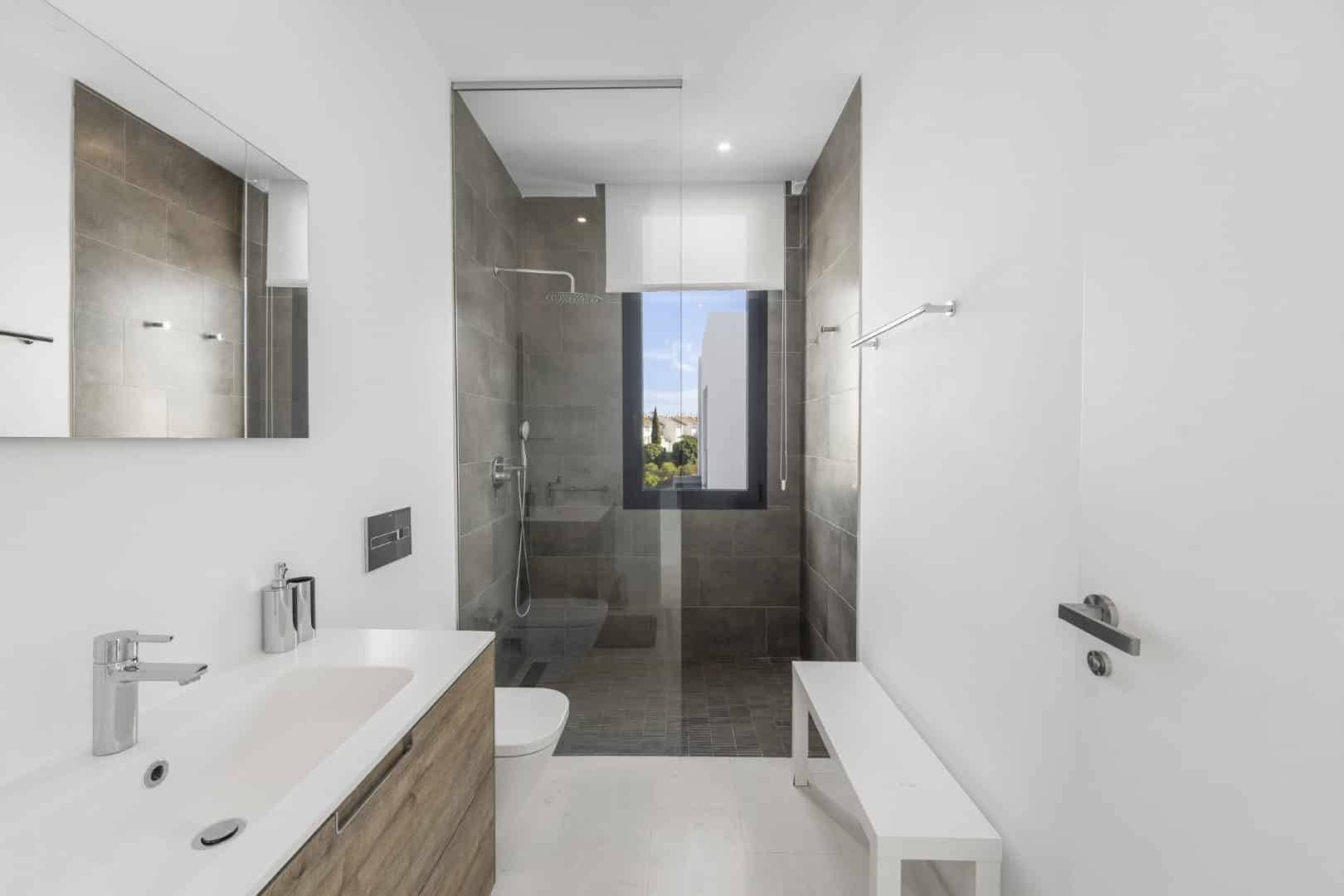 On the upper floor, the master suite enjoys its own bathroom and private terrace with stunning views over the garden, pool, golf course, and coastline. Two further bedrooms share an additional bathroom on this level.