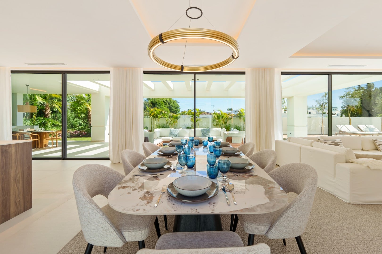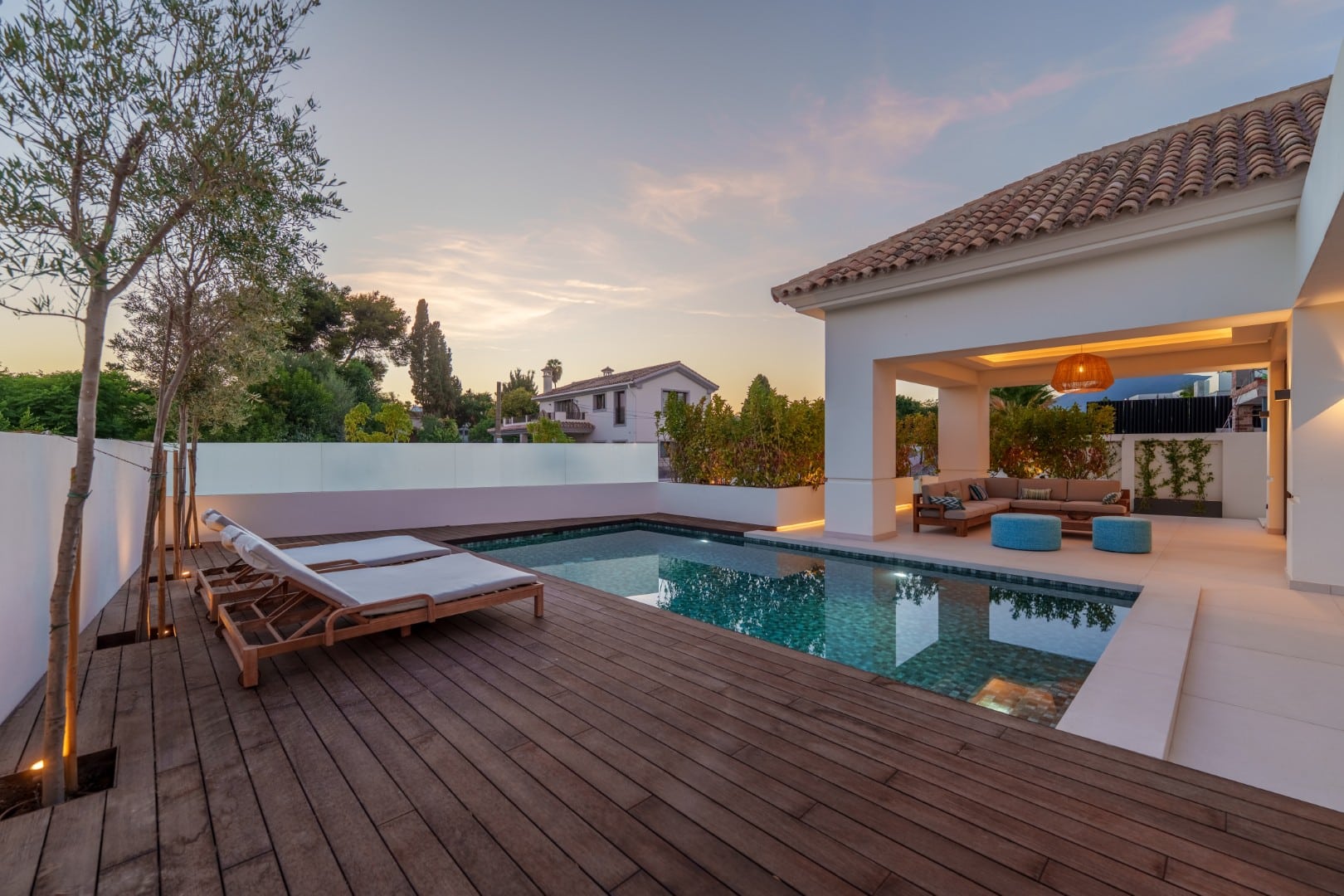 This  luxury villa in the sought-after Linda Vista Baja neighborhood of San Pedro de Alcántara combines sleek architecture with luxurious amenities. Set behind clean white walls and landscaped greenery, the property offers a private oasis with a sparkling pool bordered by a stylish wooden deck and an expansive covered terrace for dining and lounging.  Inside, the design is bright and modern, highlighted by soft neutral tones, elegant recessed lighting, and floor-to-ceiling windows that fill the home with natural light. The open-plan living and dining area features a striking custom entertainm...