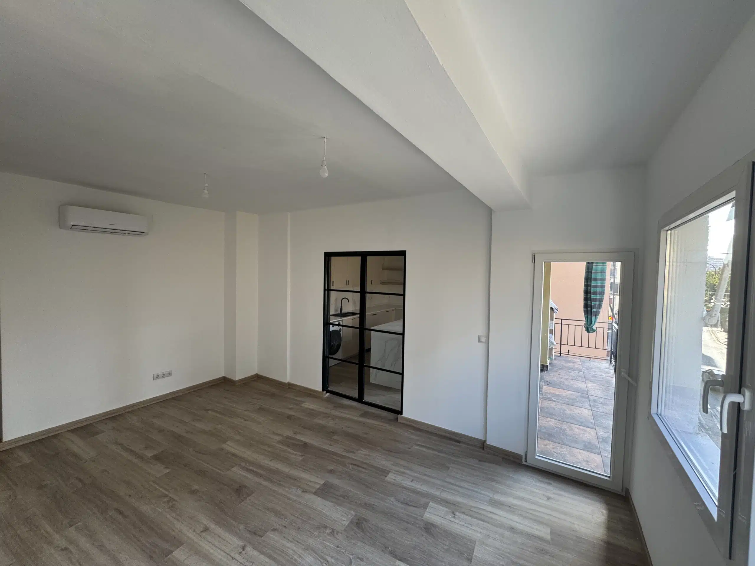 The open-plan kitchen, positioned to the side of the living area, has been designed with flexibility in mind. The kitchen can be fully closed off with a sleek sliding glass door, offering the option of separation without losing natural light. This stylish glass sliding door adds personality and character to the interior. The kitchen features a central island, integrated appliances, generous storage, and elegant contemporary finishes. The kitchen connects seamlessly to the bright living room, where large windows flood the space with natural light and provide direct access to the terrace — ideal for everyday living and entertaining.