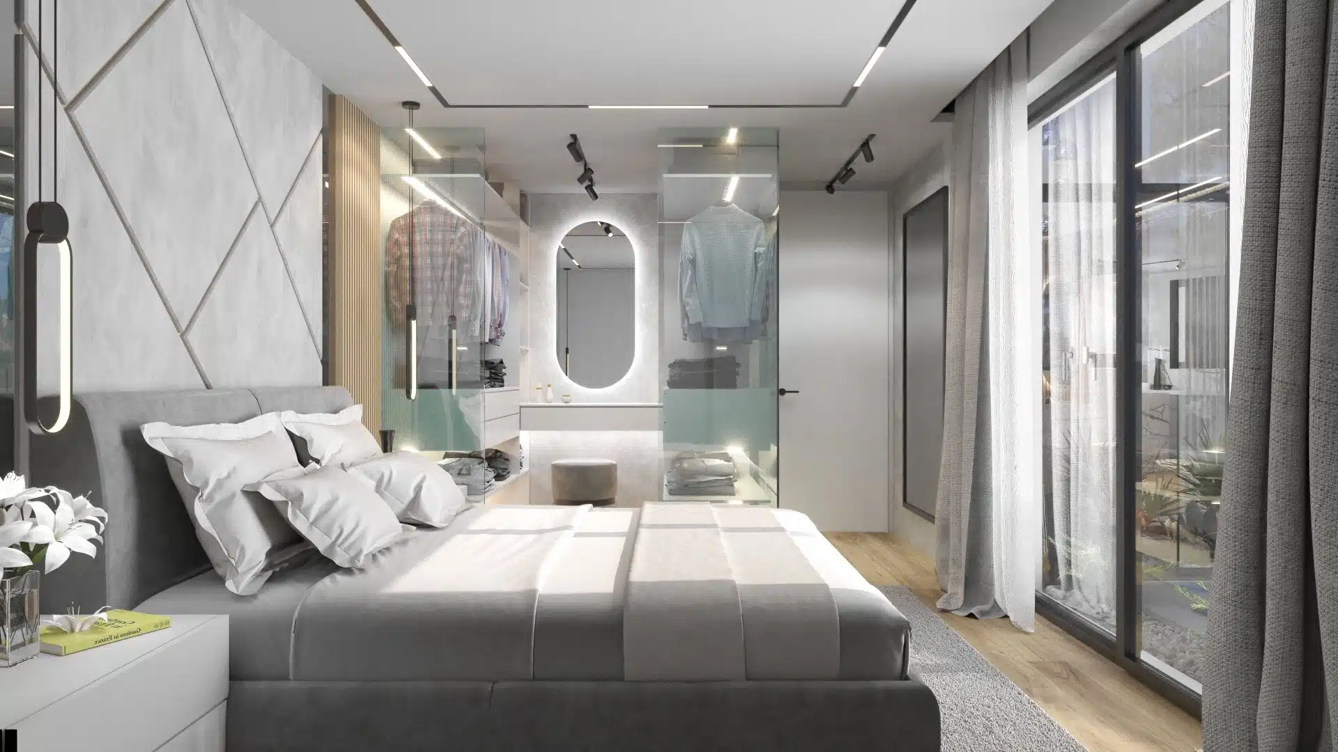 Inside the master bedroom boasts a spacious walk-in closet, providing ample storage space for your belongings. The open-plan living room seamlessly connects to the kitchen and dining area, making it the heart of the home. A cozy fireplace adds a touch of warmth to the space, while large, glass, sliding doors lead out to the terrace, creating a harmonious indoor-outdoor living experience.